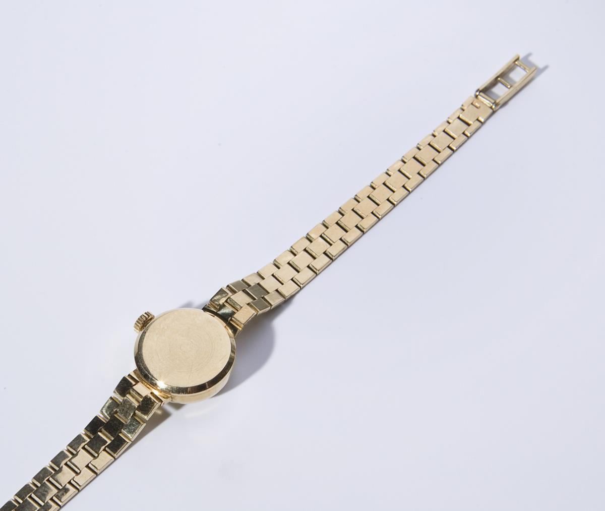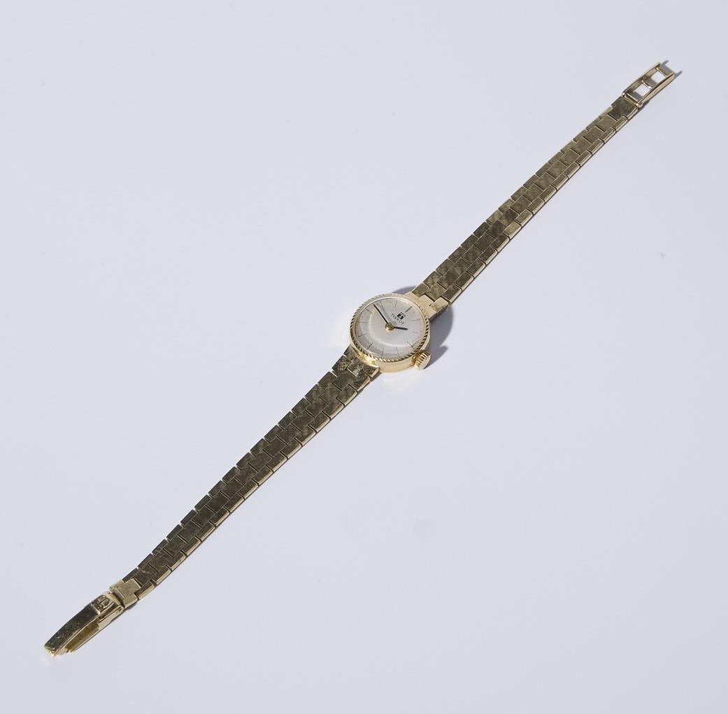 Gehäuse und Armband 585er Gelbgold. Zifferblatt, Gehäuse, Armband und Werk signiert. Ankerwerk mit Genfer Streifen, Kaliber 709. Handaufzug, Werk läuft. Armband mit Faltschließe. L 18 cm, ø 16 mm, 18 g.