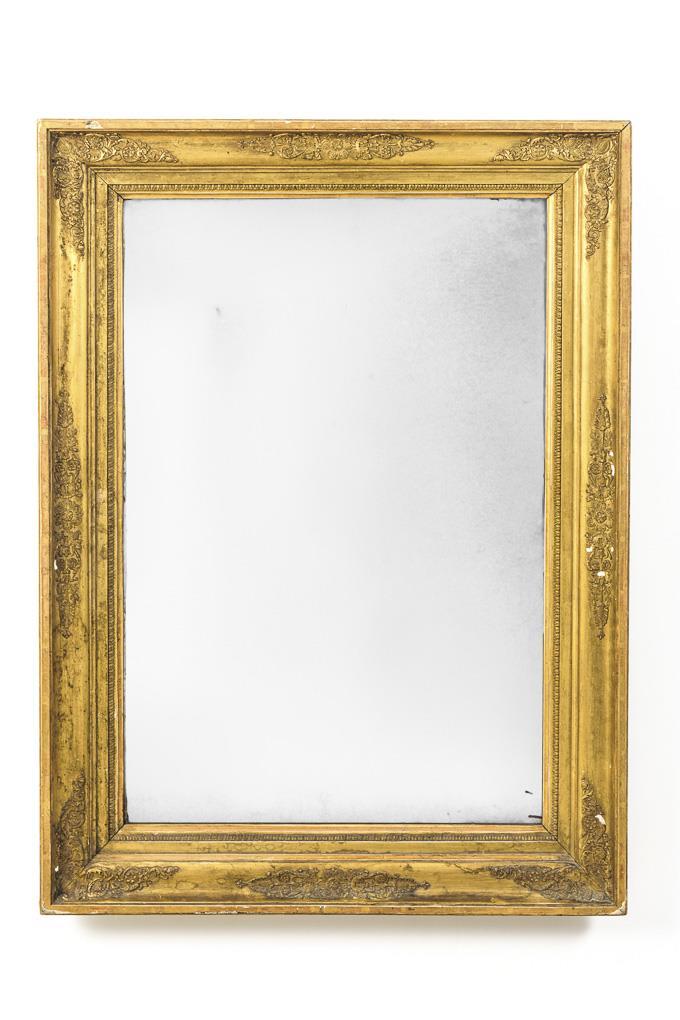 Rechteckiger Wandspiegel mit getrepptem Rahmen, Kymation und Akanthusverzierung. Alters-/Gebrauchsspuren, Spiegelglas stärker fleckig, Goldfassung berieben.