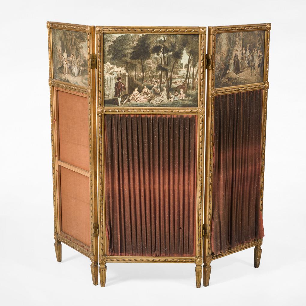 Aus 3 Elementen zusammengesetzter Raumteiler mit Scharnieren zur freien Beweglichkeit, zart dekoriert mit antikisierenden Zierleisten und Rosetten; verglaste obere Bereiche mit hinterlegten Farblithografien mit galanten Szenen, untere Bereiche mit roten Stoffen in Faltmanier; verso roter glatter Stoffbezug mit Zierleiste. Alters-/Gebrauchsspuren, Stoffbespannung mit Defekten und Fehlteilen, 1 Scharnier mit Defekt.