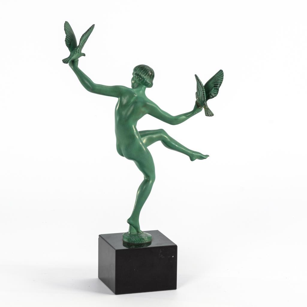 Im Stil des Art déco gestaltete Tänzerin mit Tauben in den Händen. Klebespur an einer Taube, geringe Alters-/Gebrauchsspuren.