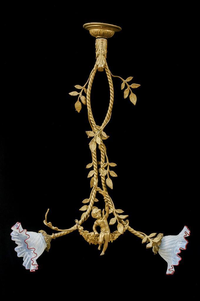 2-flammige Hängelampe an seilartiger Verstrebung mit Palmetten-Baldachin, verziert mit Blumenranken und vollplastischem Bronze-Engel auf Feston sitzend, flankiert von 2 blütenförmigen, gepressten Glasschirm mit rotem Rand. Alters-/Gebrauchsspuren.