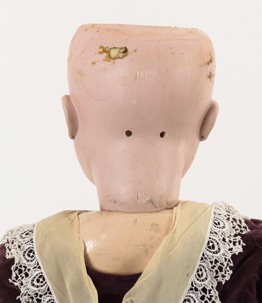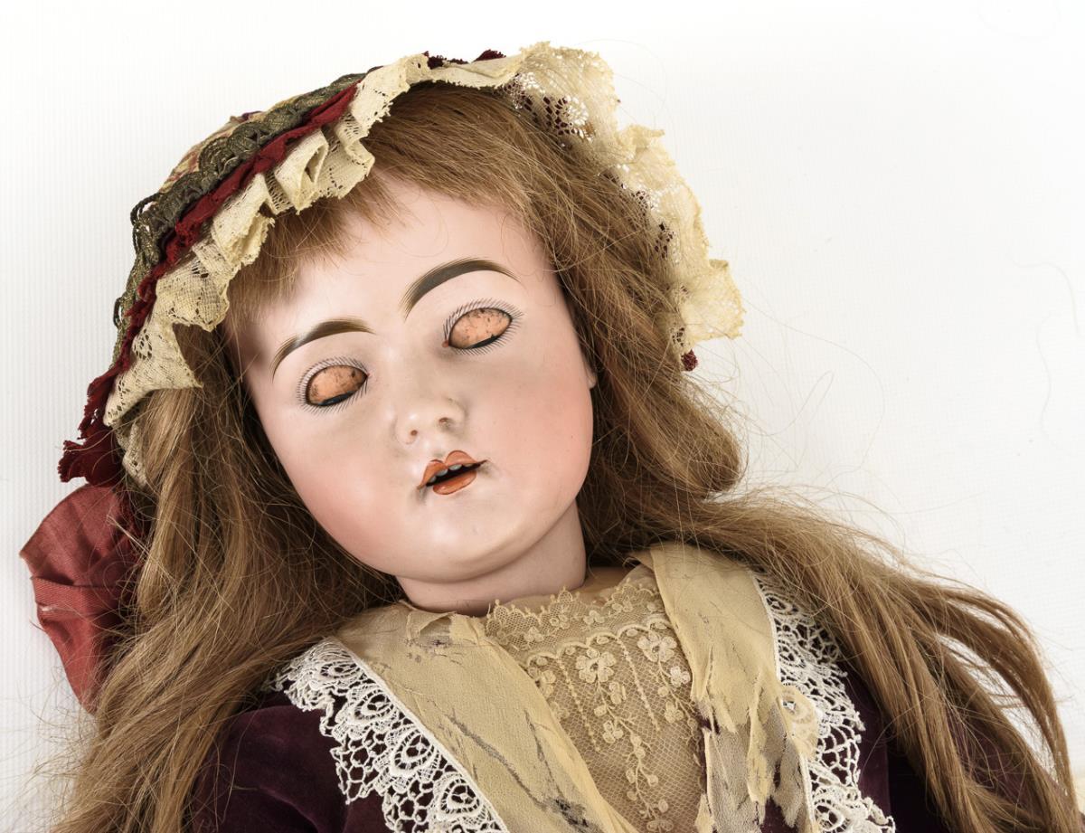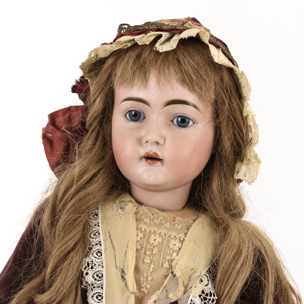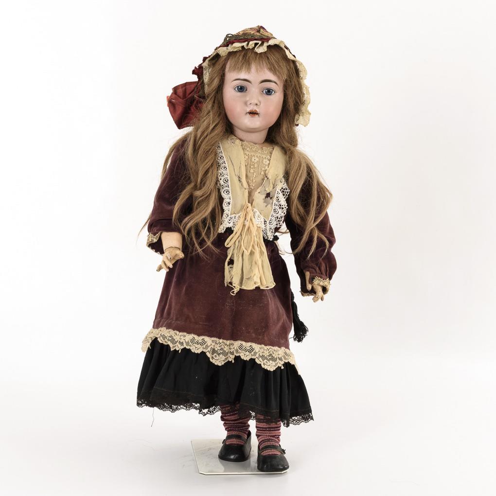 Kurbelkopf, blaue Schlafaugen, Ohrlöcher, lange mittelblonde Echthaarperücke. 17-teiliger Gliederkörper. Violettes Samtkleid mit hellen Spitzen, passende Samtkappe, schwarze Lederschuhe. Kopf durchleuchtet: ohne Defekte, lediglich etwas Perückenpull und 1 kleiner Chip am Ohrläppchen. Kleid mit Defekten.
