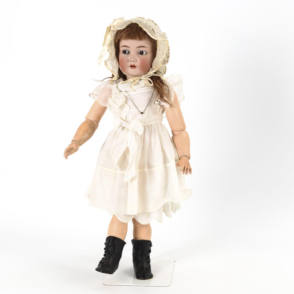 Kurbelkopf, braune Schlaf-/Schelmenaugen, rotbraune Echthaarperücke. 19-teiliger Gliederkörper (in Toddlerart). Altes weißes Kleid aus zartem Stoff, weiße Haube, nachgenähte schwarze Lederstiefelchen. Restaurierter Defekt am Hinterkopf. Körper partiell übermalt, Augenlider unbemalt.