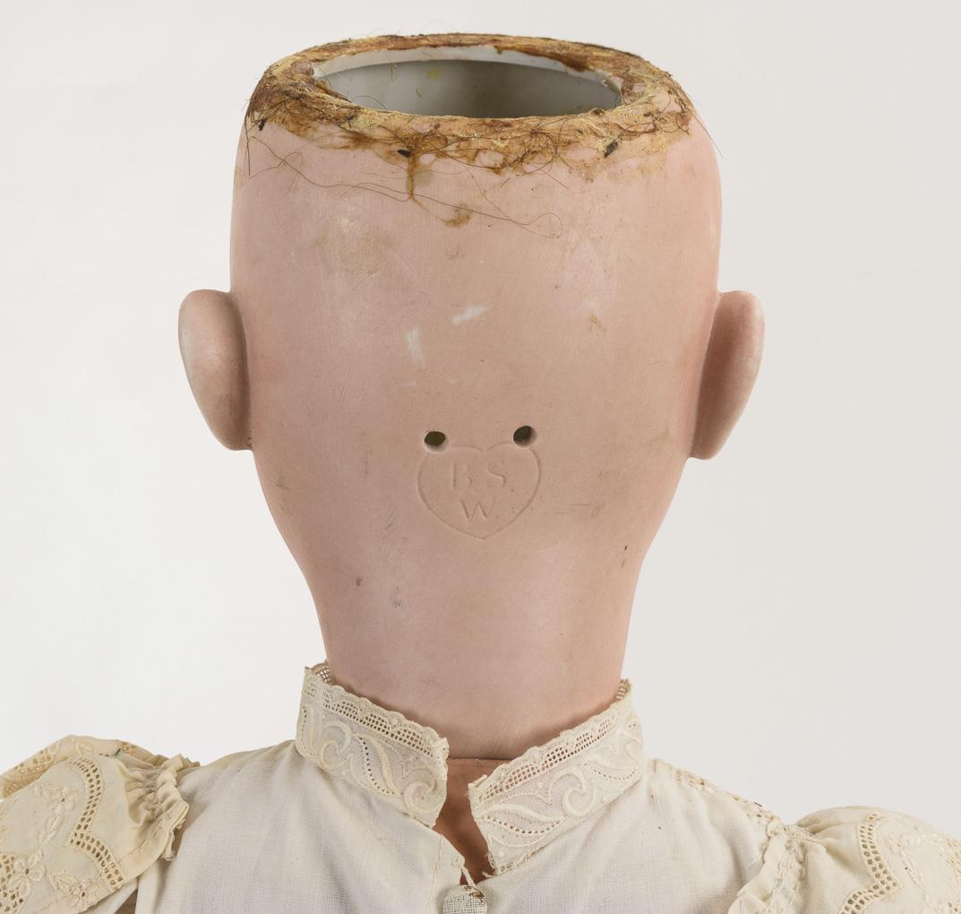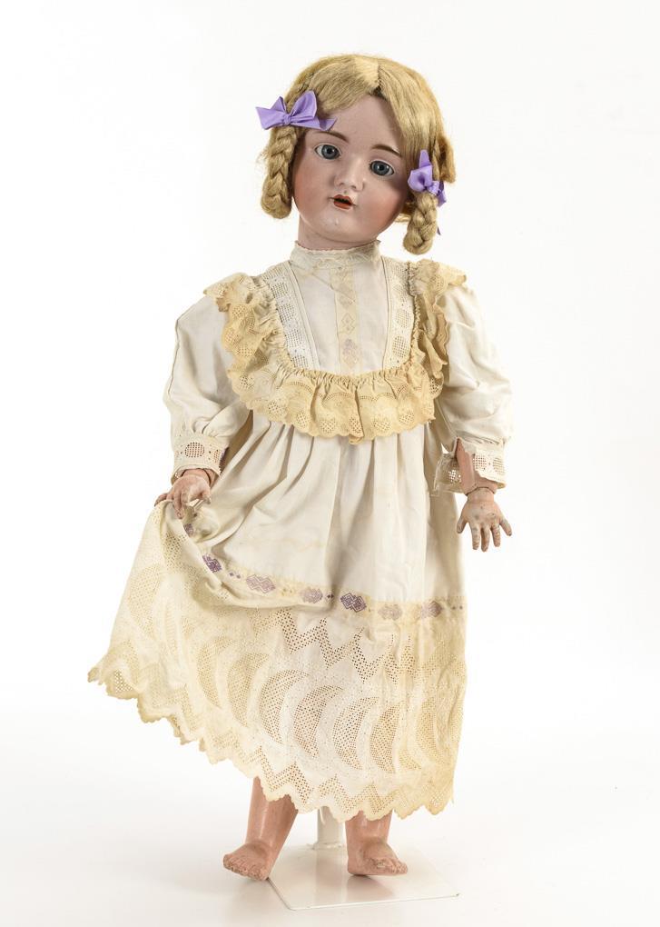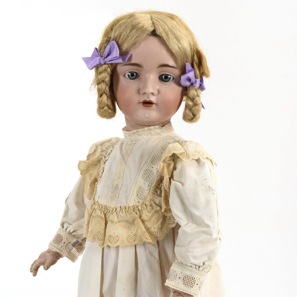 Kurbelkopf, nachgegipste blaue Augen, Kunsthaarperücke mit Affenschaukeln. 17-teiliger Gliederkörper. Weißes Kleid mit Spitze, violette Haarschleifen. Kopf durchleuchtet: ohne Defekte. Körper mit leichten Altersspuren, linke Hand repariert.