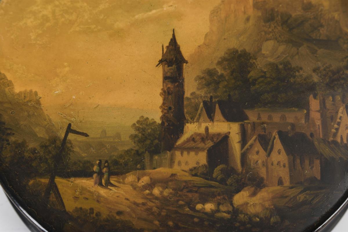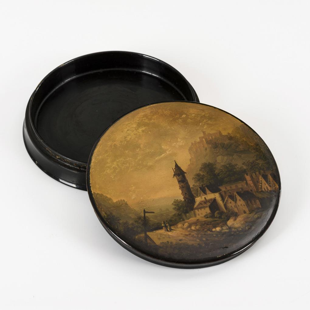 Runde Lackdose mit romantischer Landschaft.