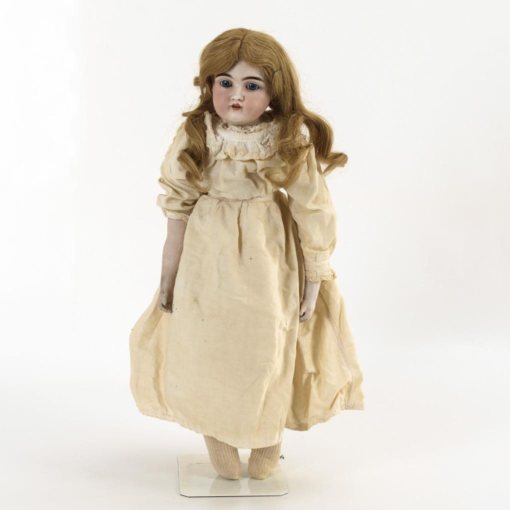 Brustkopf, blaue Schlafaugen, lange Echthaarperücke. Lederkörper mit Biskuitarmen, Kniezwickeln und Stoffbeinen. Weißes Kleid. Kopfdeckel fest vergipst: nicht durchleuchtet, jedoch ohne sichtbare Defekte. Körper mit Altersspuren und kleinen Defekten, linke Hand restauriert.