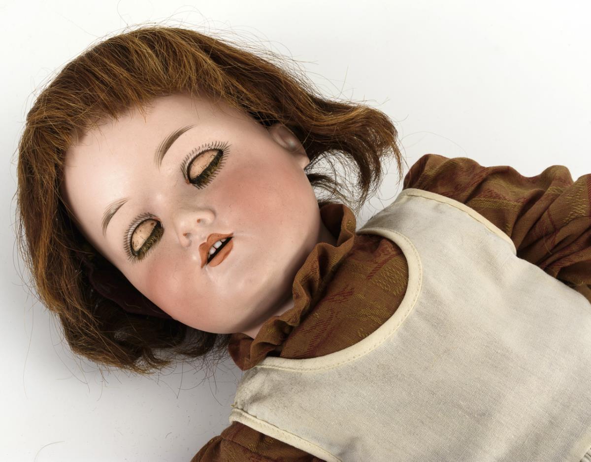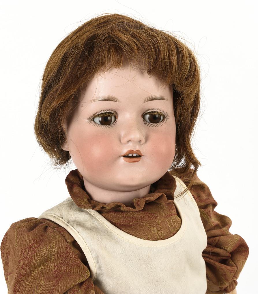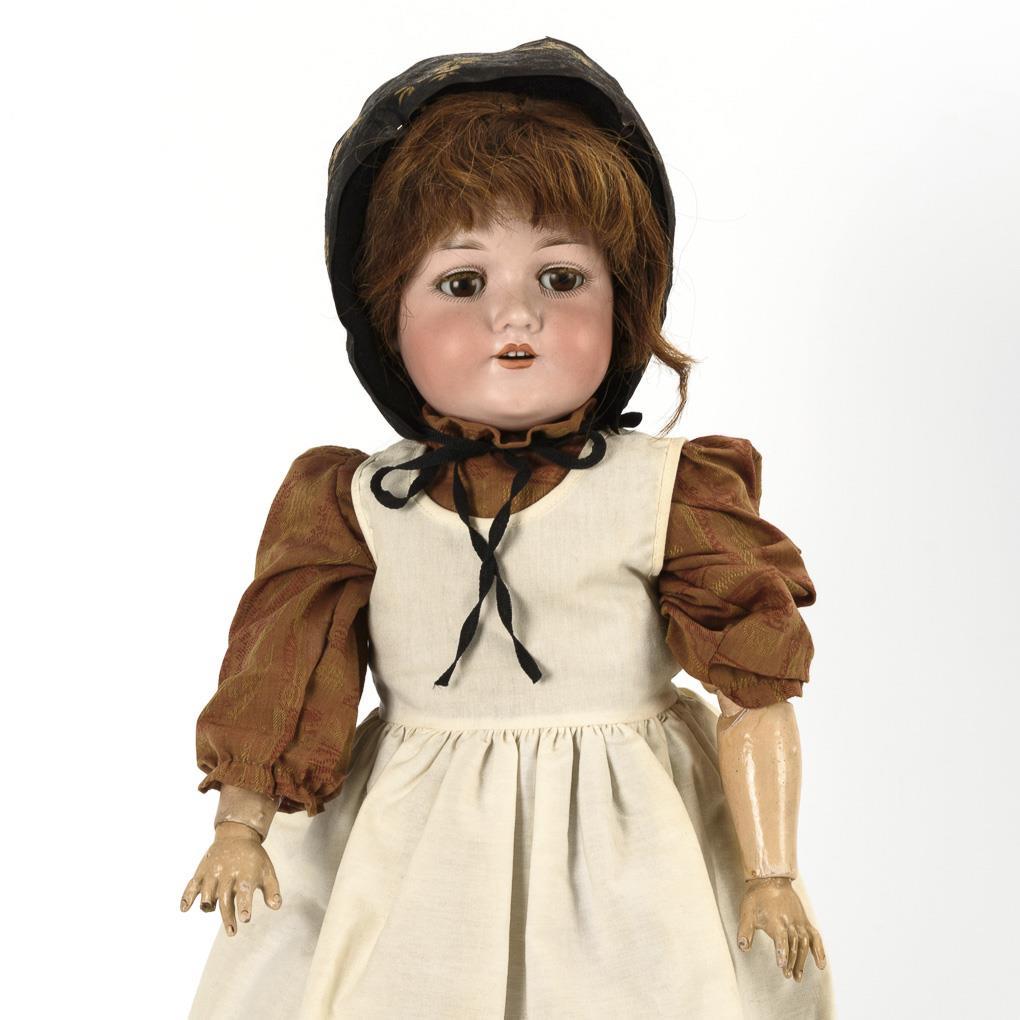 Kurbelkopf, braune Schlafaugen, Wimpern, rotbraune Echthaarperücke. 15-teiliger Gliederkörper. Rotbraunes Kleid, weiße Schürze, schwarze Haube. Kopf durchleuchtet: ohne Defekte. 1 Finger rechts fehlt.