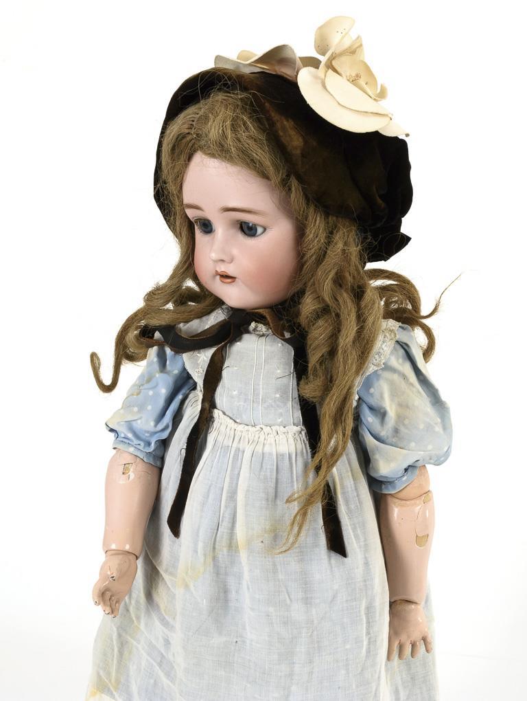 Kurbelkopf, blaue Schlafaugen, Wimpernreste, Ohrlöcher, blonde Flachs?perücke. 15-teiliger Gliederkörper. Blaues Kleid mit weißen Pünktchen, weiße Schürze, schwarze Samthaube. Kopf durchleuchtet: ohne Defekte, lediglich kleine Chips an den Ohrlöchern. Arme mit Farbdefekten.