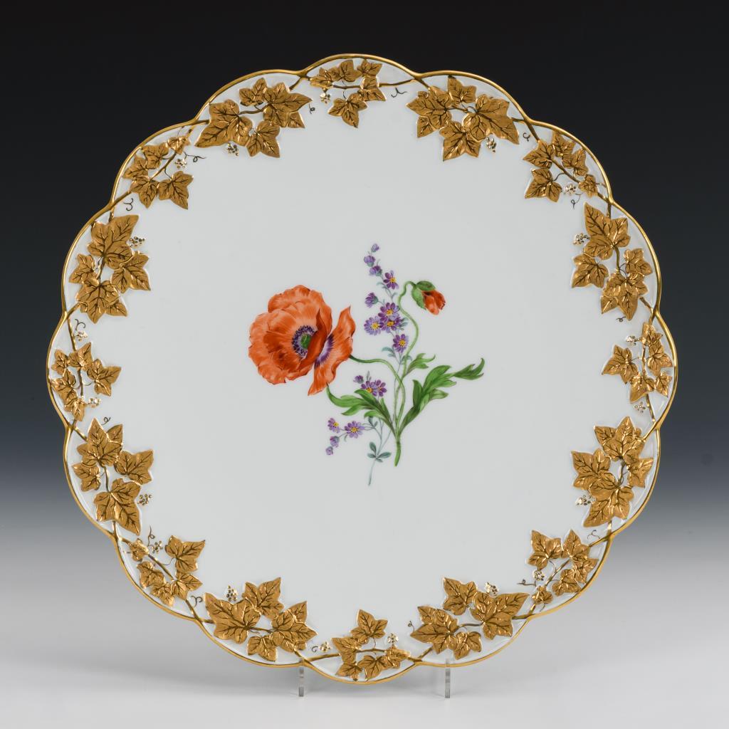 Platte mit Efeurelief, im Spiegel zweiteilige Blumenmalerei mit Mohn.