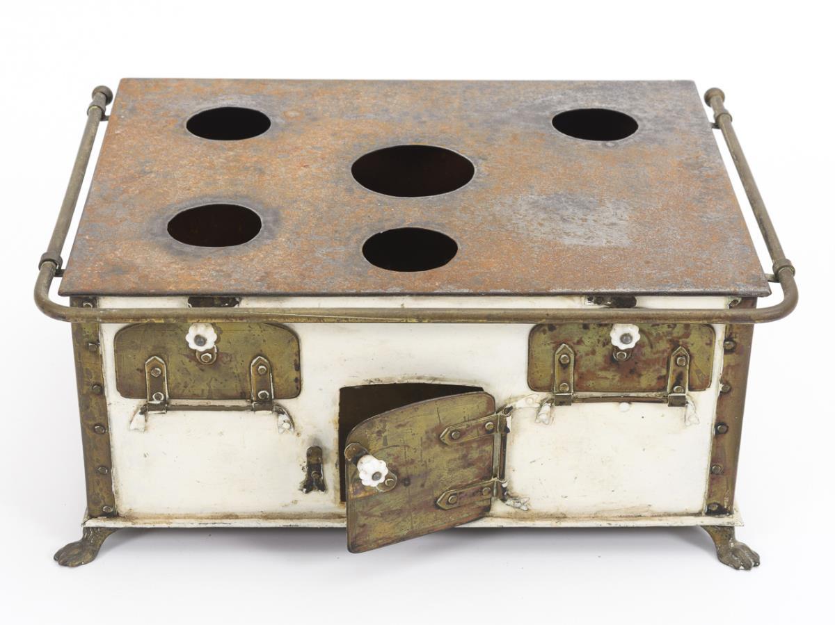 2 Herde mit Messingklappen, 1x für Elektrobetrieb mit Blendtüren (Kabel fehlt). Altersspuren, 1x nachlackiert.