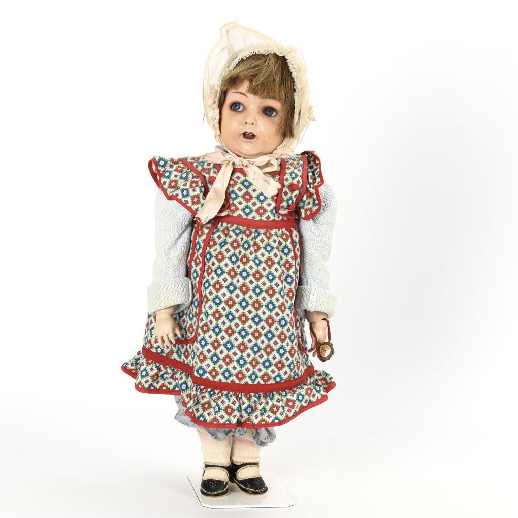 Kurbelkopf, blaue Schlaf-/Schelmenaugen, Wimpernreste, defekte Echthaarperücke. Schöner, 17-teiliger Toddlerkörper. Rot gemusterte Schürze, weiße Haube, schwarze Wachstuchschuhe. Perückenpull, feiner Haarriss am Hinterkopf. Arme locker gespannt.