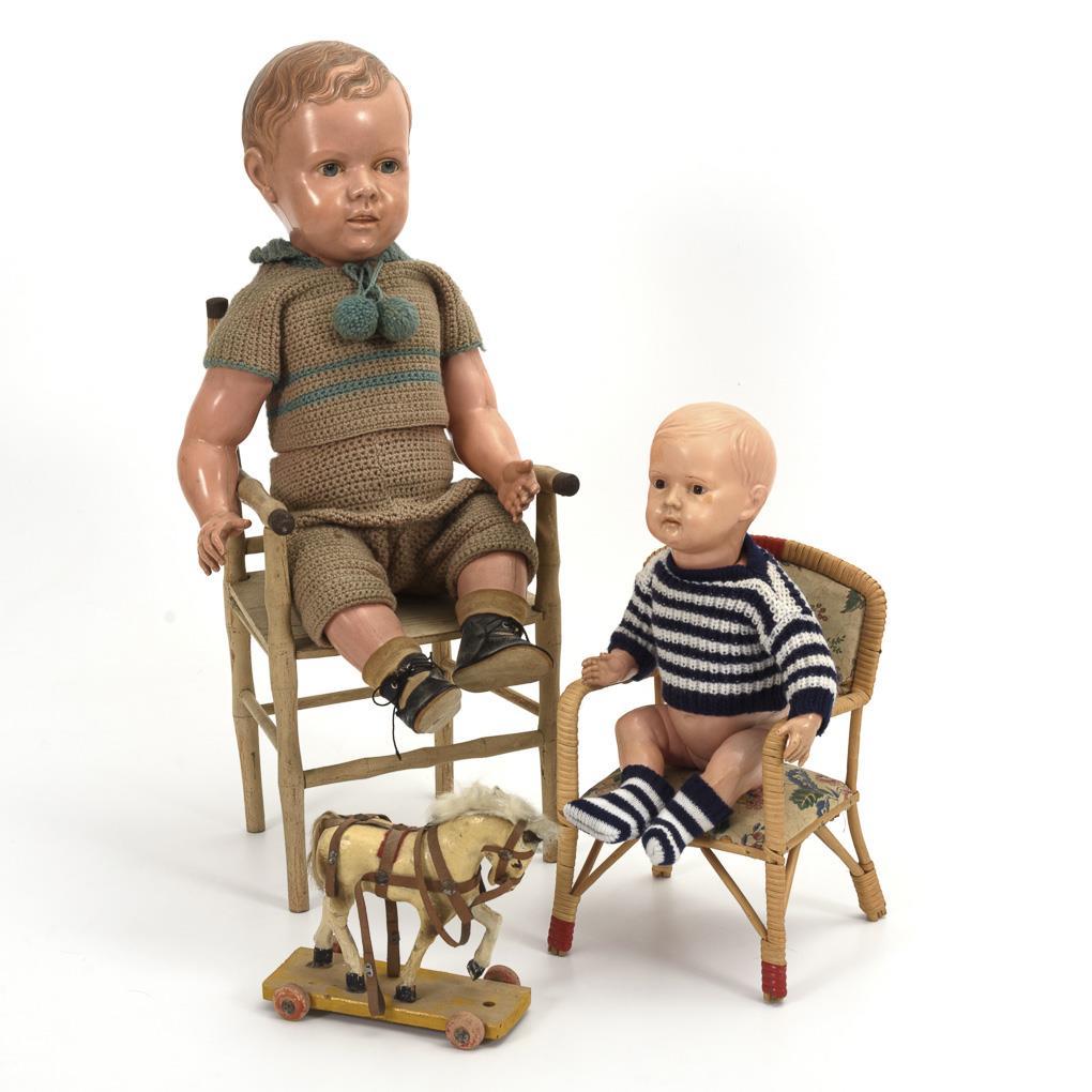 Schildkröt-"Bebi 1925" und großer Cellba-Junge, jeweils mit Strickkleidung, auf Stühlchen sitzend. Dazu kleines Pferd auf Räderplatte. Altersspuren, Glieder locker gespannt.