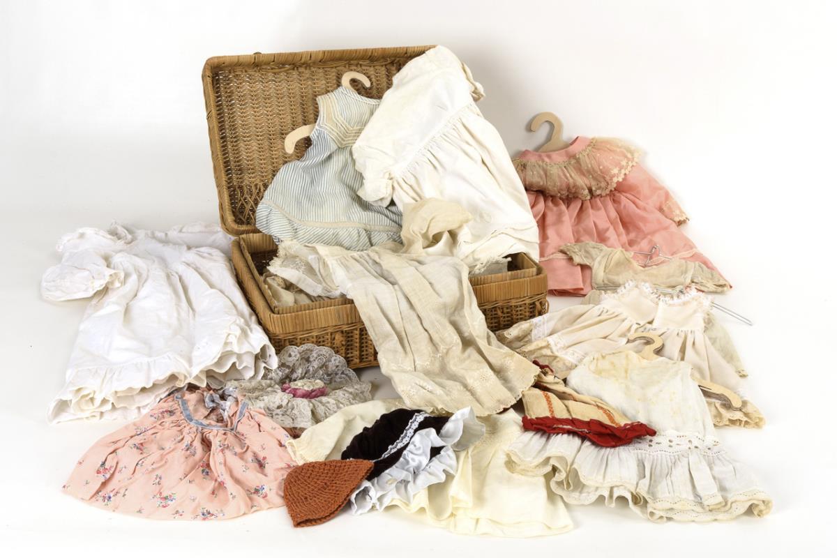 Konvolut Puppenkleidung in Korbkoffer.
