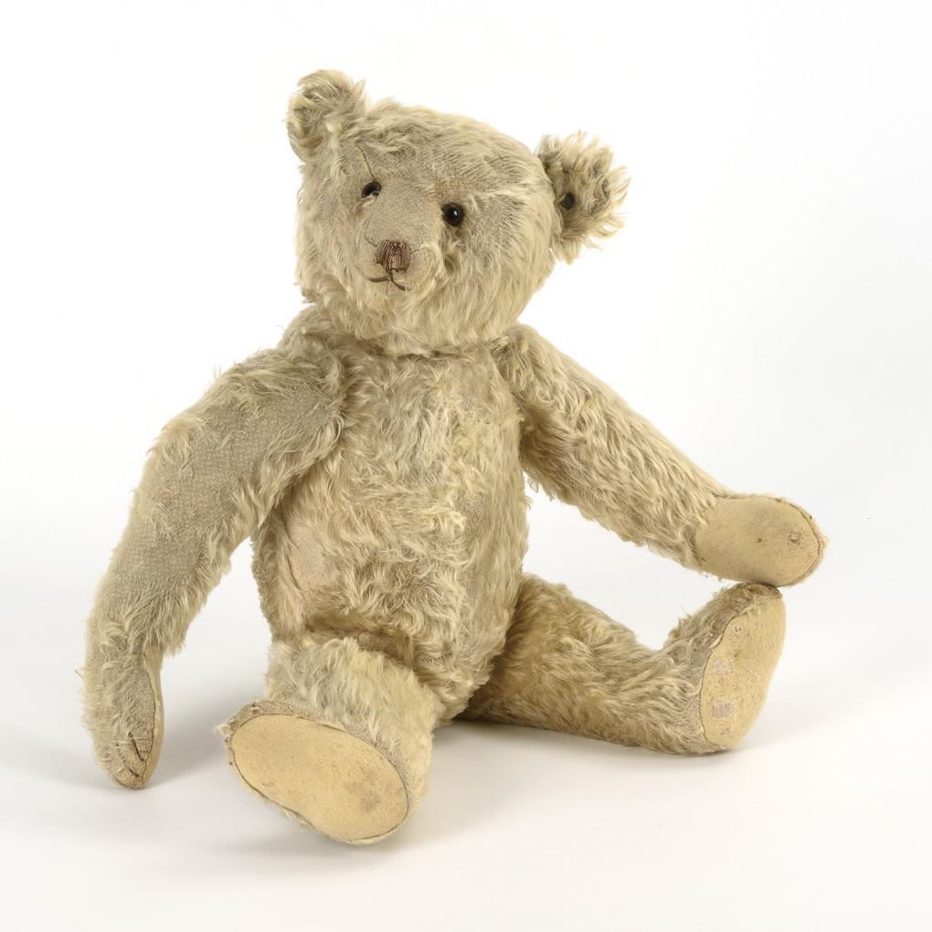 Steiff-Bär mit drehbarem Kopf, Buckel, langen Armen und Filzpfoten. Nase und rechter Arm abgeliebt, kleine Defekte an Fell und Pfoten, Stimme müde.