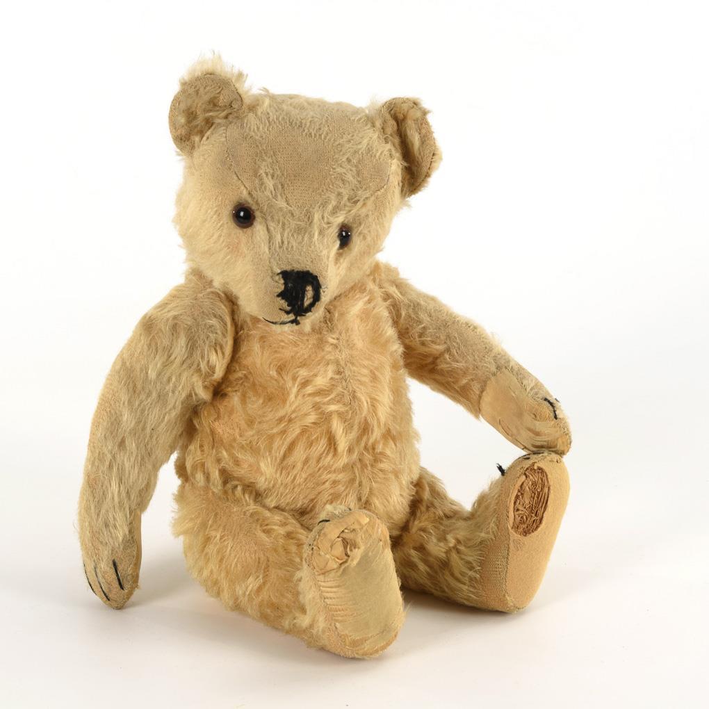 Teddy mit drehbarem Kopf und Glasaugen. Partiell stark abgeliebt, 3 Pfoten übernäht, 1x defekt, Druckstimme verstummt.