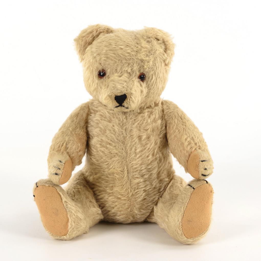 Bär mit drehbarem Kopf, Glasaugen und rosa Filzpfoten. 1 Ohr repariert, Stimme intakt.