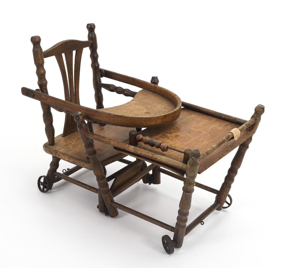 Umklappbarer Hochstuhl mit Tischchen und Rädern. / Kleiner Armlehnstuhl. Altersspuren, 1 Strebe gebrochen.