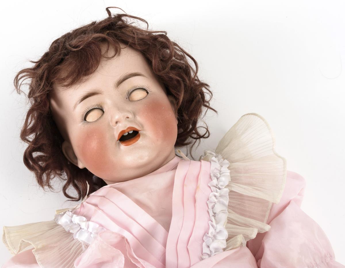 Kurbelkopf, braune Schlaf-/Schelmenaugen, rotbraune Mohairperücke. 5-teiliger Sitzbabykörper. Rosa Kleid mit weißen Spitzen. Kopf durchleuchtet: ohne Defekte. Körper partiell übermalt, Farbdefekt am Bauch, Ringfinger rechts defekt.