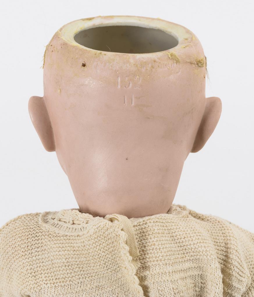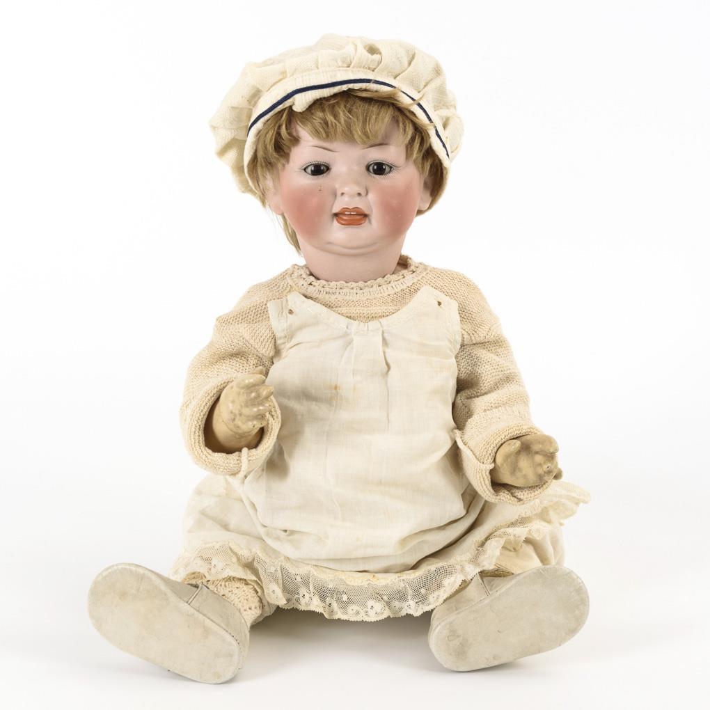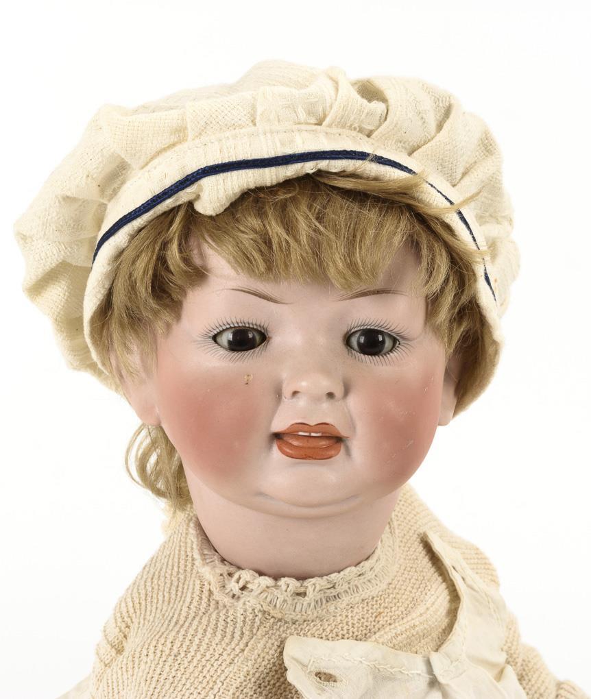 Kurbelkopf, braune Schlafaugen, offen/geschlossener Mund mit 2 gemalten Zähnchen, blonde Mohairperücke. 5-teiliger Sitzbabykörper. Weiße Babykleidung mit Barett im Matrosenstil. Kopf durchleuchtet: ohne Defekte.