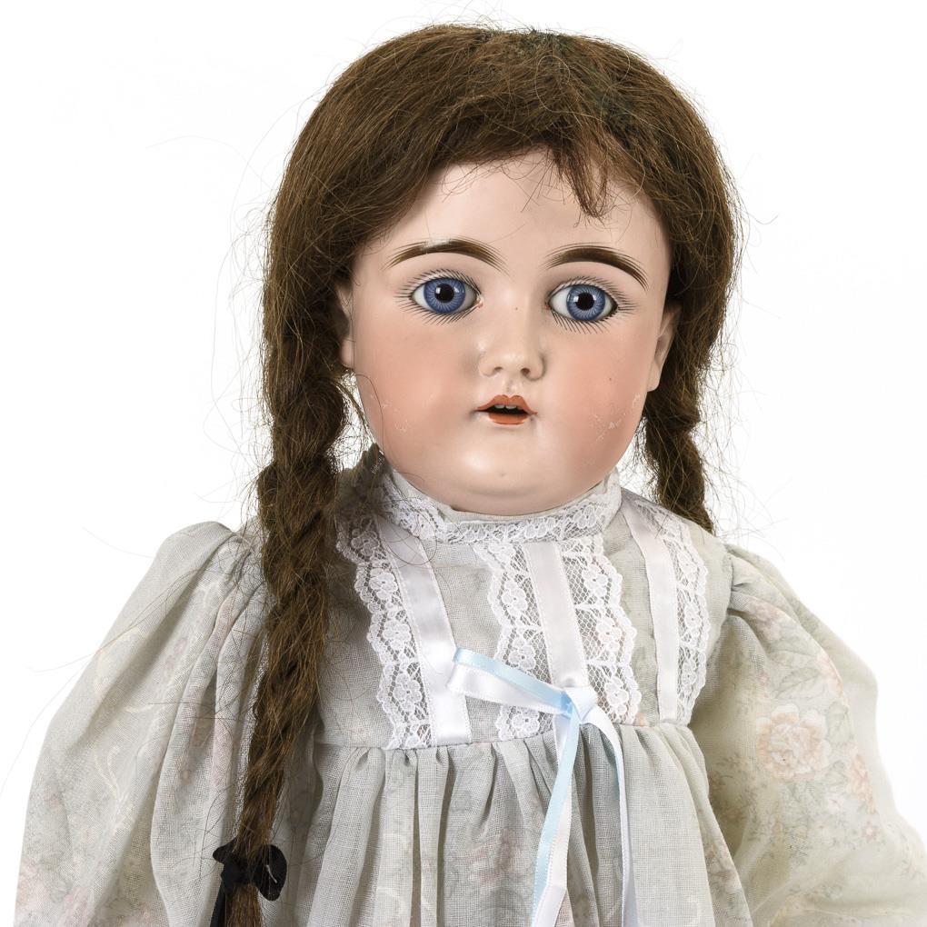 Kopf mit festem Deckel, feste blaue Augen, lange braune Echthaarzöpfe. Lederkörper mit Biskuitunterarmen und Zwickeln an Ellbogen, Po und Knien. Helles Kleid mit weißer Spitze. Kopf nicht durchleuchtet: ohne sichtbare Defekte. Körper mit Reparaturen, Finger an beiden Händen bestoßen.