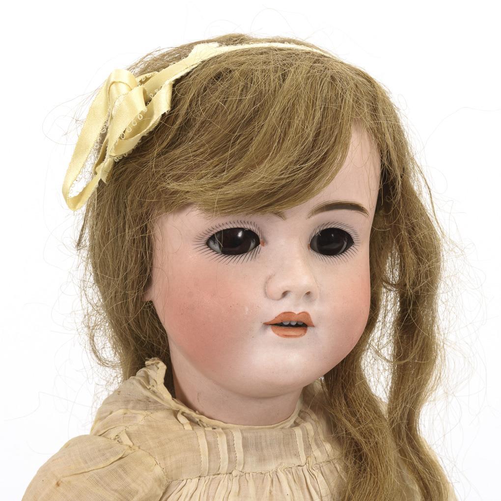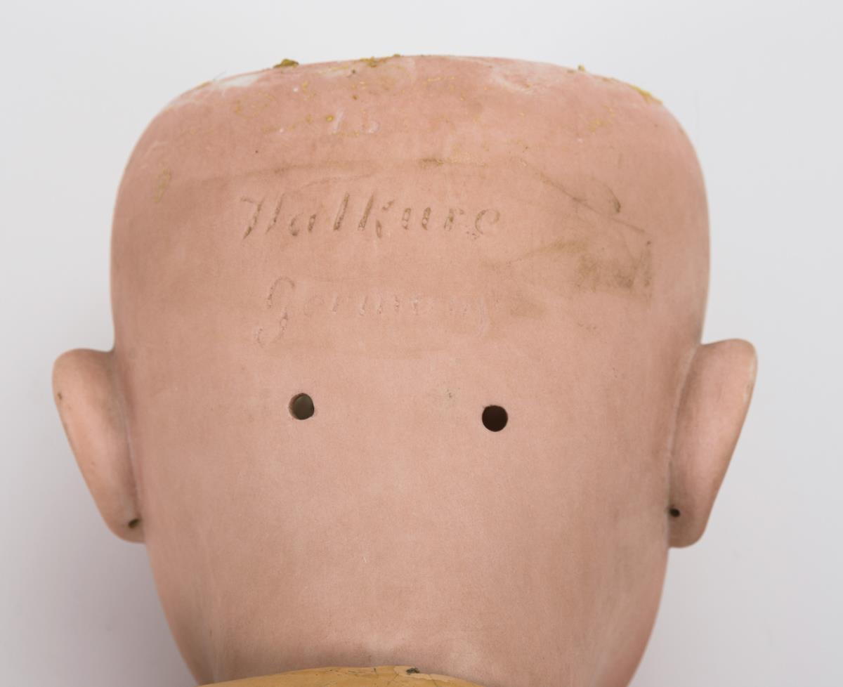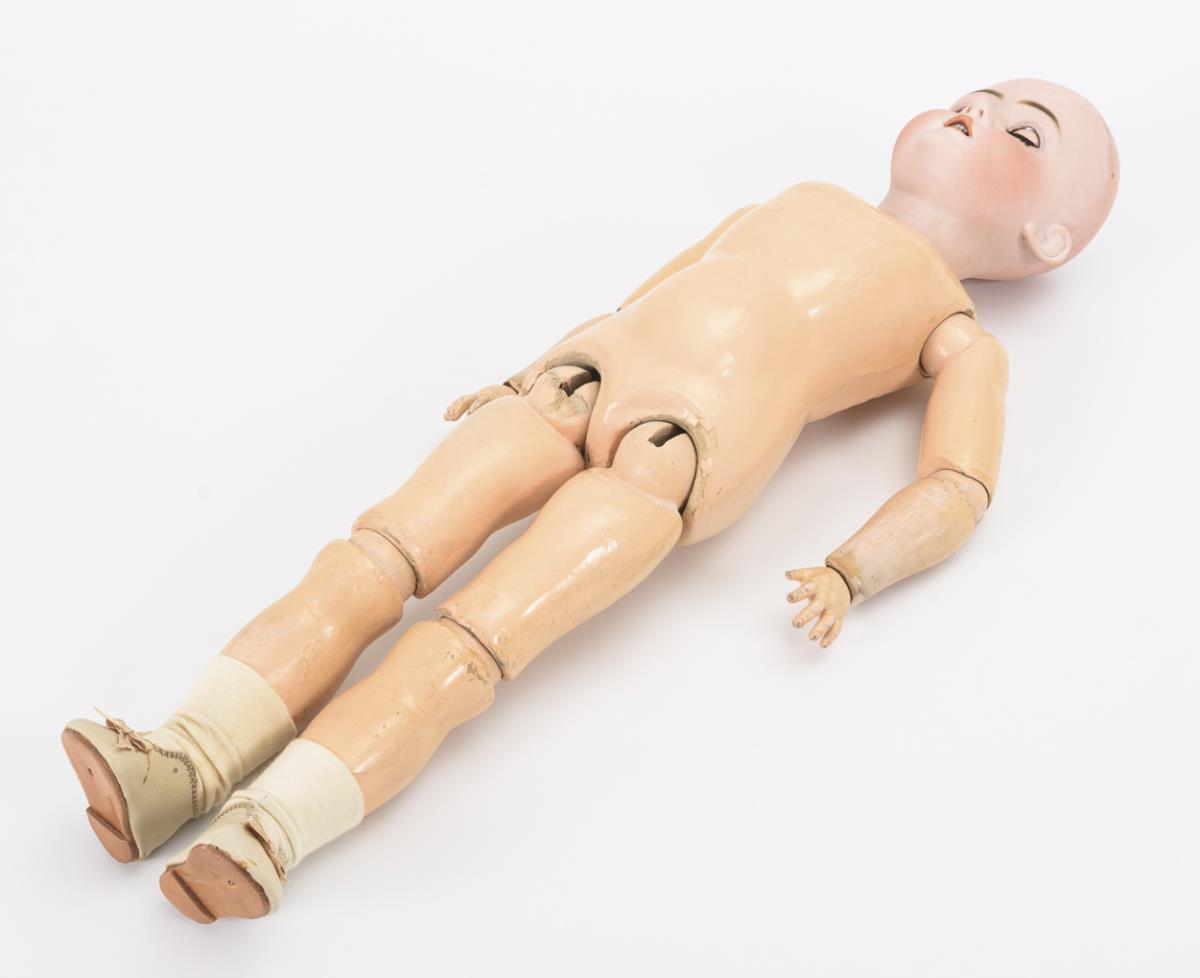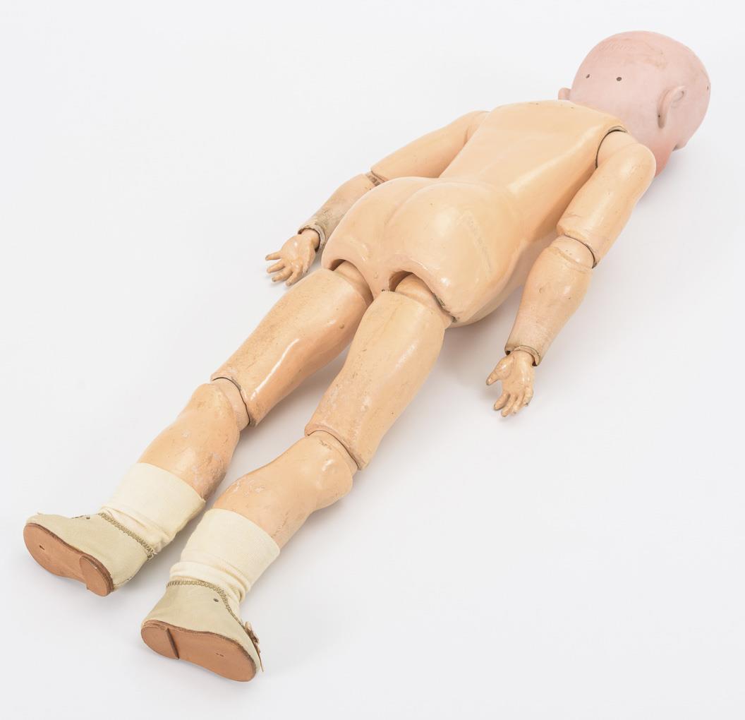 Kurbelkopf, braune Schlafaugen, Ohrlöcher, blonde Echthaarperücke. 15-teiliger Gliederkörper.