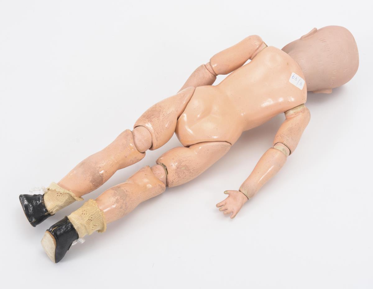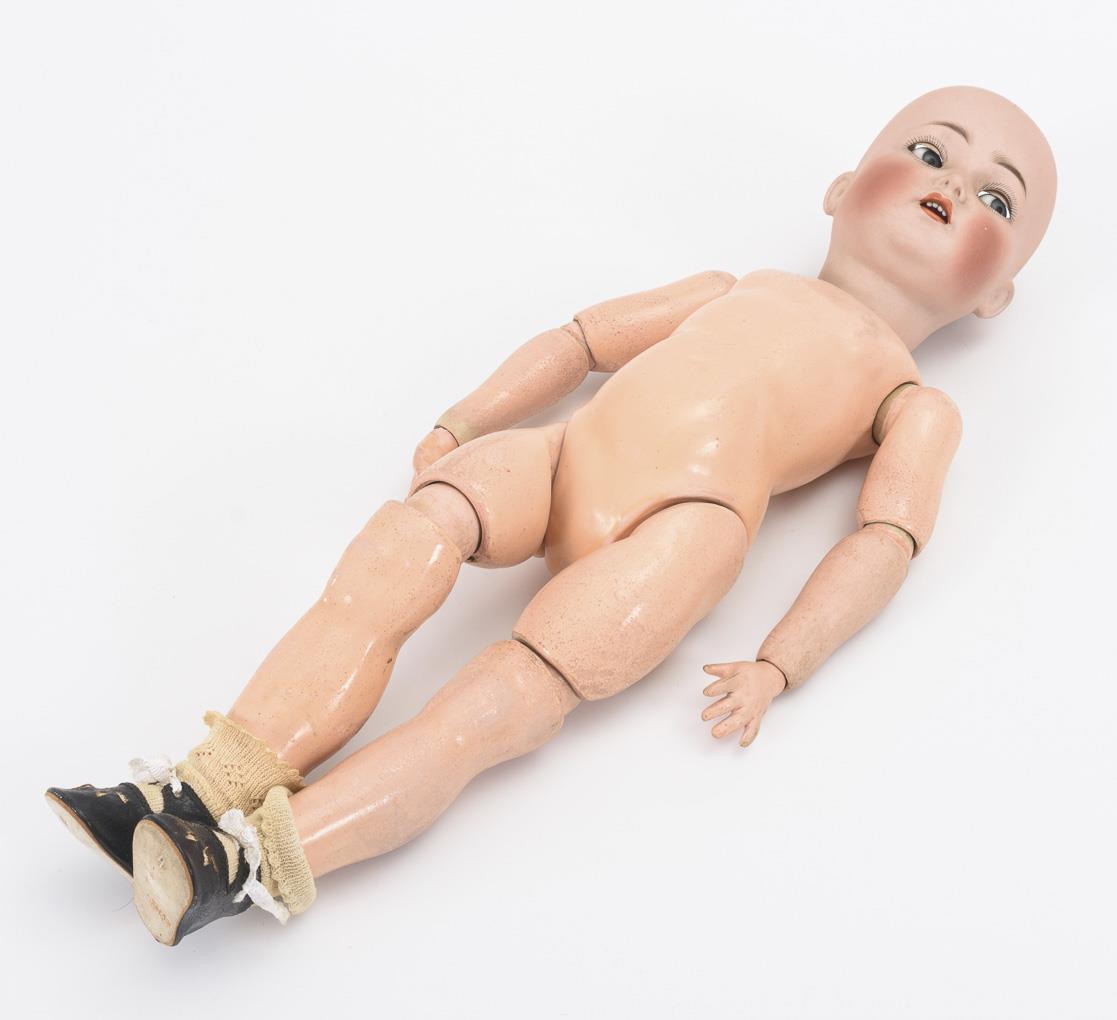 Kurbelkopf, blaue Schlaf-/Schelmenaugen, braune Langhaarperücke. 17-teiliger Toddlerkörper. Helle Kleidung, weiße Haube, schwarze Wachstuchschuhe. Kopf durchleuchtet: ohne Defekte. Augen lose.