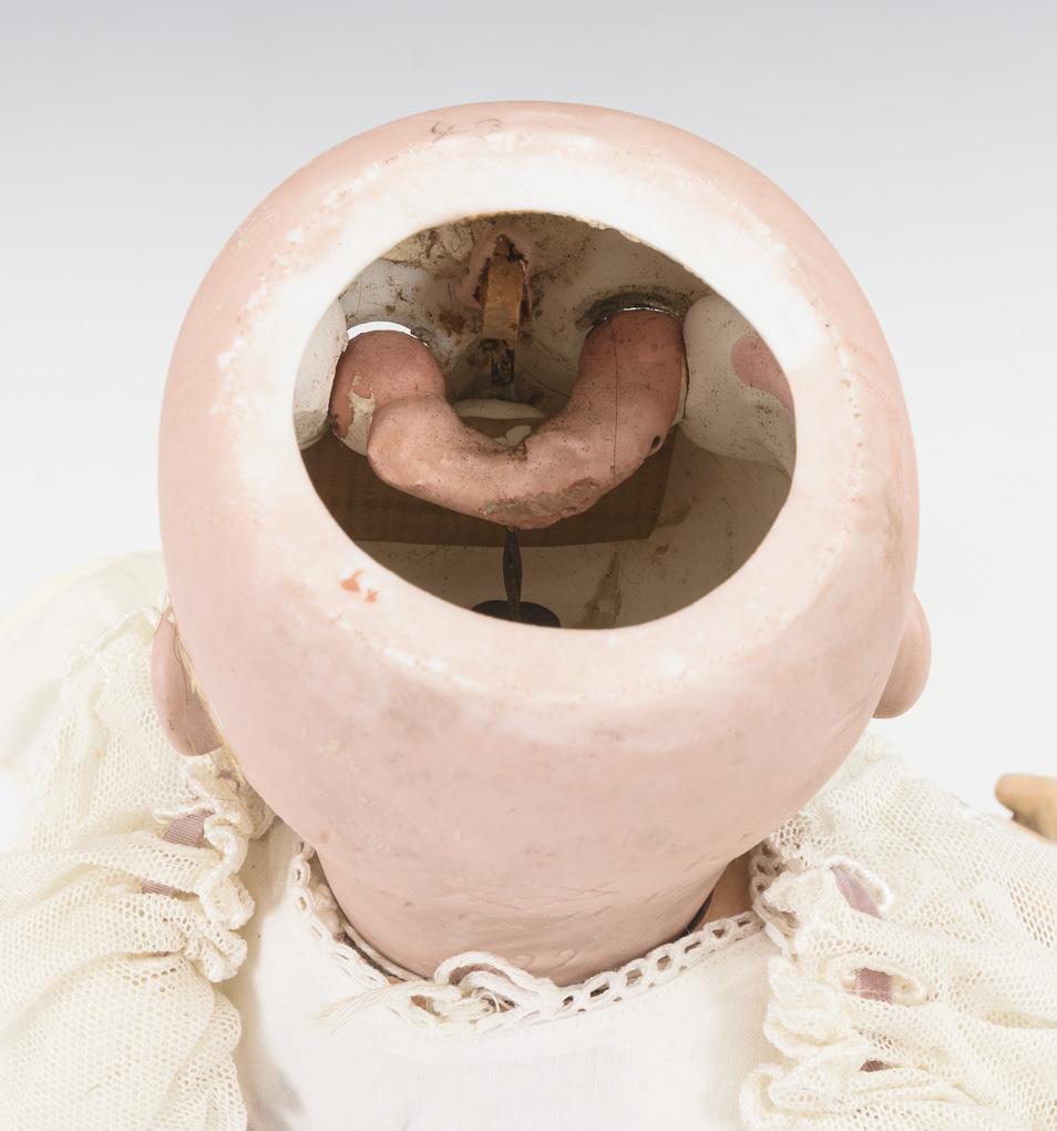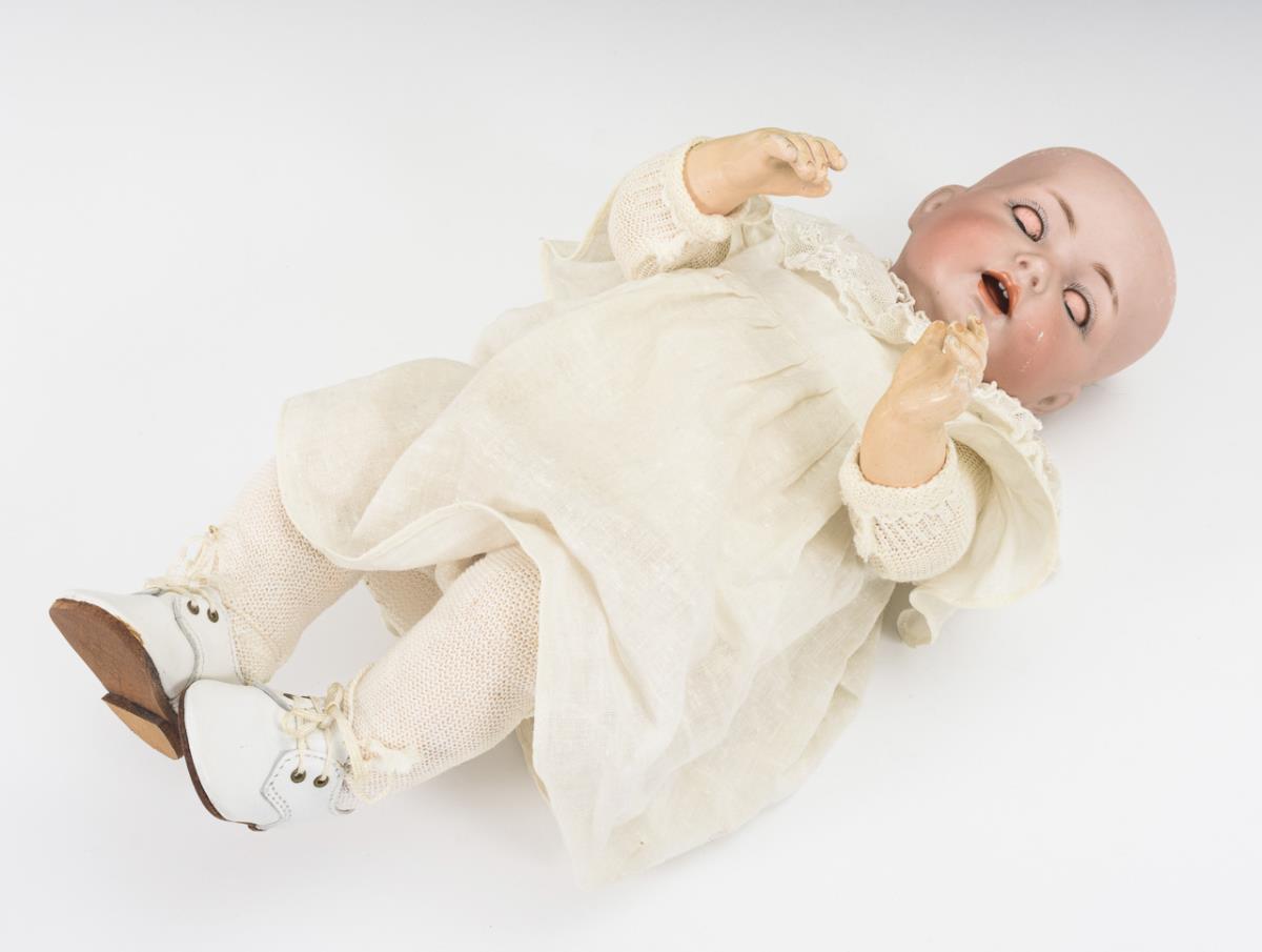 Kurbelkopf, blaue Schlafaugen, braune Echthaarperücke. 5-teiliger Sitzbabykörper mit 2-geteiltem Torso. Weißes Kleidchen, passende Haube und Schuhe. Kopf durchleuchtet: ohne Defekte, lediglich minimaler Perückenpull und 1 Brandriss hinter dem rechten Ohr. Stimme verstummt.