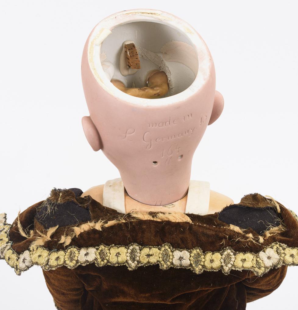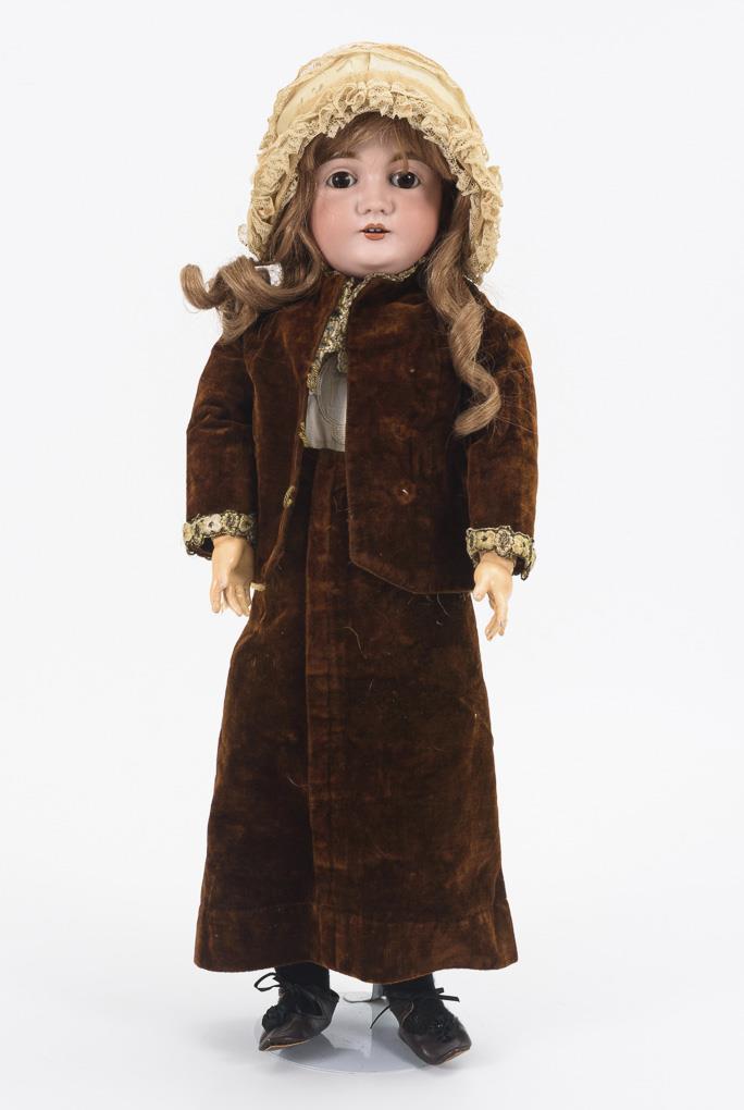Kurbelkopf, braune Schlafaugen, blonde Lockenperücke. 15-teiliger Gliederkörper. Braunes Samtkostüm, helle Haube mit Spitzenbesatz, jüngere Lederschuhe. Kopf durchleuchtet: ohne Defekte.
