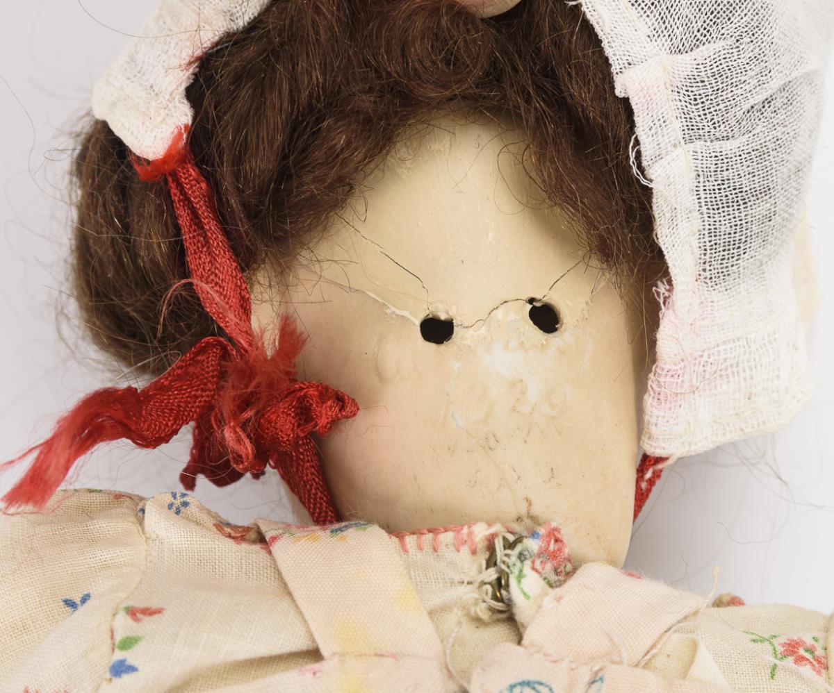 Zierliche Puppe mit defektem Kopf und neuem Gliederkörper. / Charakterbaby mit Kopffragment und Sitzbabykörper. / Dazu zahlreiche Puppenglieder aus Holz, Masse und Biskuit für den Puppendoktor. Mit Defekten.