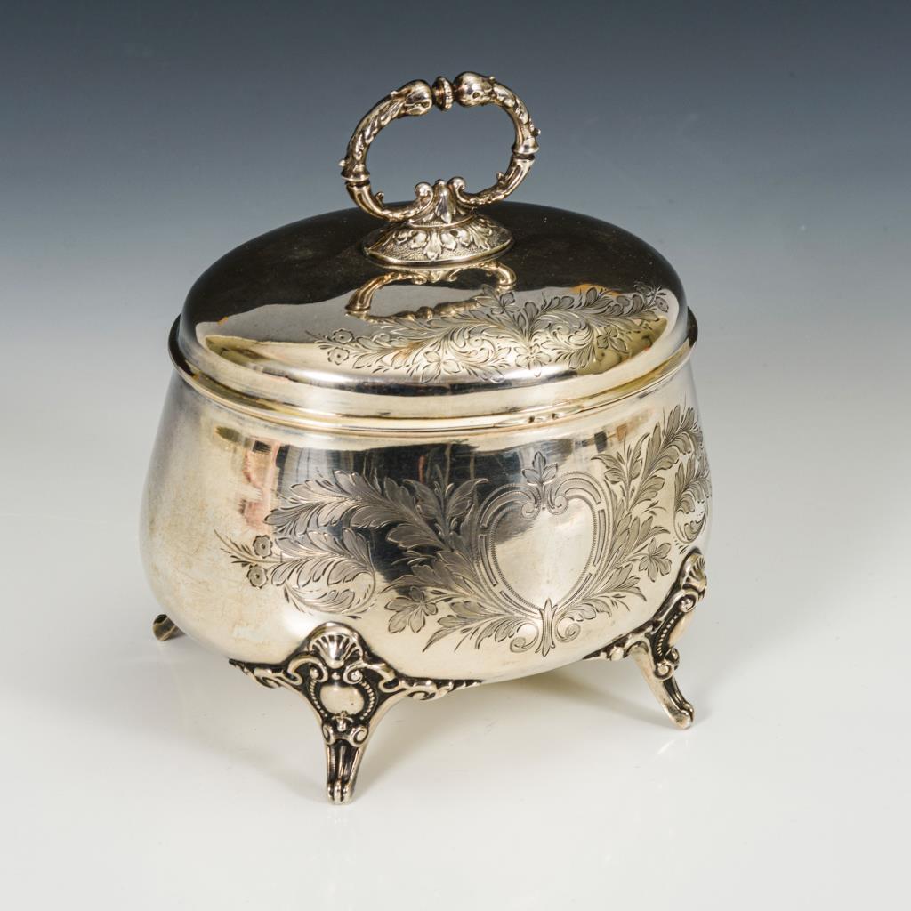 Ovale Dose mit Floralgravuren und ringförmigem Deckelknauf. Minimale Dellen.