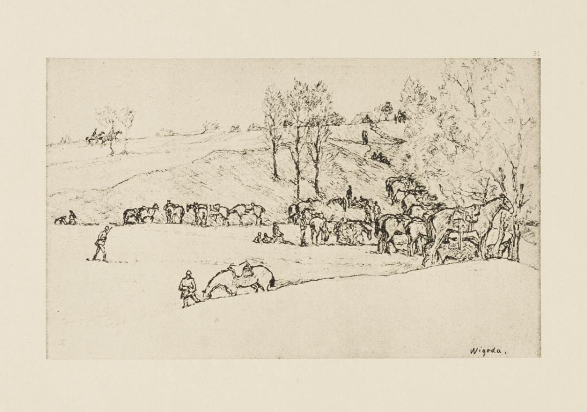 Vollständige Mappe mit 60 Lichtdrucken nach Zeichnungen aus dem Kriegsgebiet Karpathen, Galizien-Polen und Russland mit Titel und Inhaltsverzeichnis, hrsg. vom Nationalen Verlag, Charlottenburg/Berlin 1916; zugunsten der Nationalstiftung für die Hinterbliebenen der im Kriege Gefallenen. Mappe stockfleckig, Titelblatt mit Lichtschaden, Lichtdrucke an den Rändern teils mit Stockflecken.