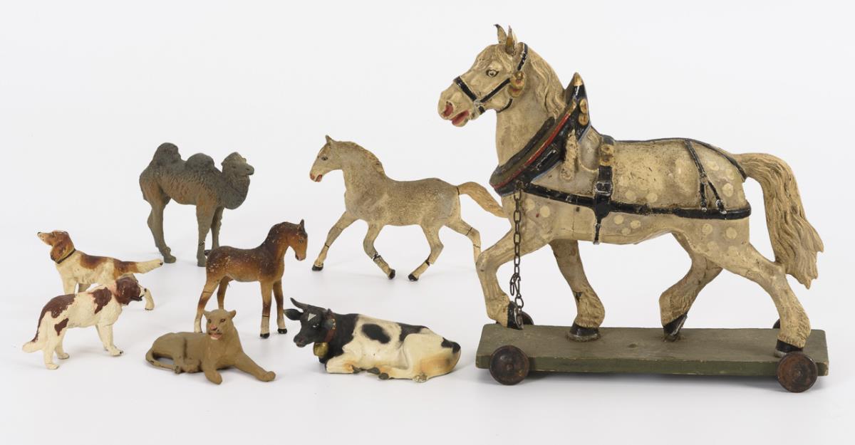 Bemaltes Metallpferd, auf Räderplatte aus Holz. Dazu verschiedene Tiere: 2 Pferde, 2 Hunde, Kuh, Kamel und Löwin. Altersspuren, teils kleine Defekte.