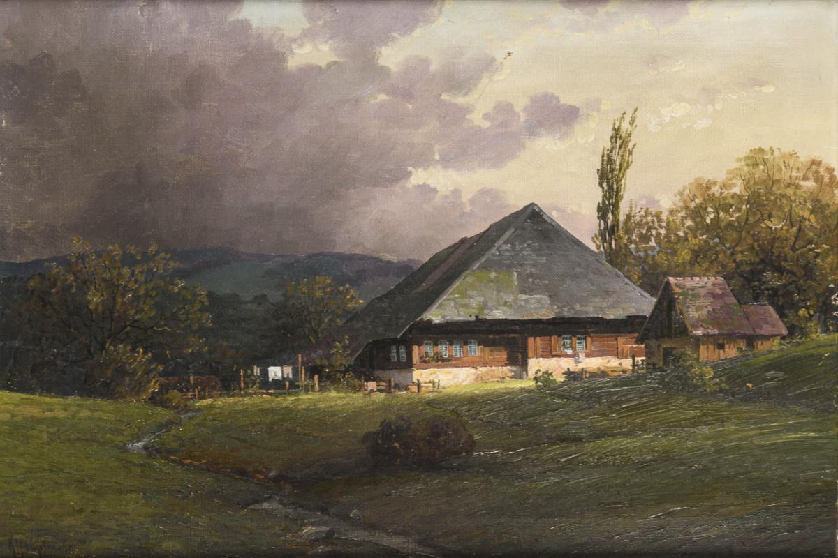 Großes Bauerngehöft im bergiger Landschaft unter dunkel aufziehenden Wolken. Ein kleiner Defekt.