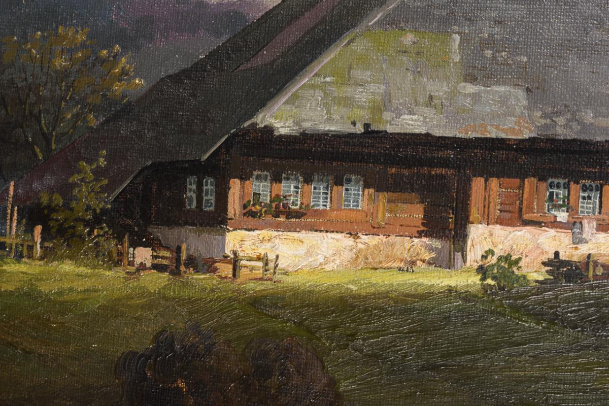 Großes Bauerngehöft im bergiger Landschaft unter dunkel aufziehenden Wolken. Ein kleiner Defekt.