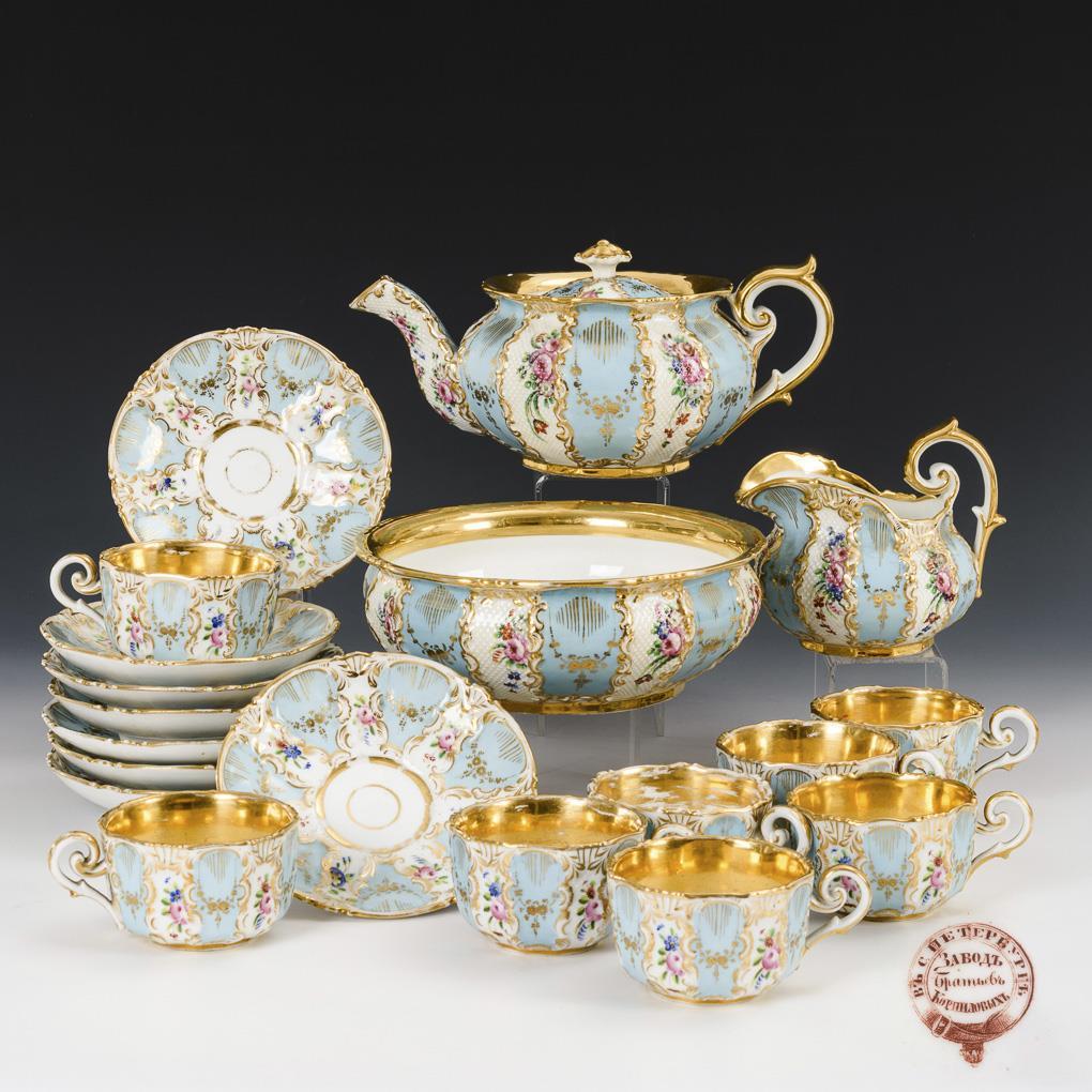 19 Teile. Mit Rocaillerelief sowie alternierend angeordneten Steinelstreifen mit Blumenmalerei und türkisfarbenen Fondstreifen mit Goldmalerei. Teekanne (H 12 cm), Milchkännchen, 8 Tassen, 8 Untertassen und 1 Spülkumme (Ø 20 cm). Kleiner Chip am Kannenrand, partiell Gold etwas berieben, 1 Tassenhenkel geklebt.