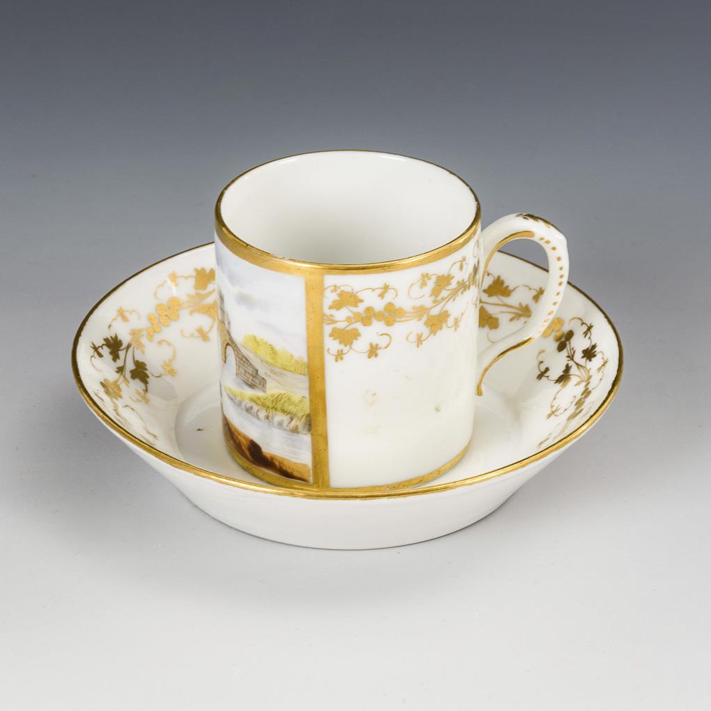 Polychrom bemalt, goldstaffiert. H Tasse 6 cm, Ø originale Untertasse 13 cm.