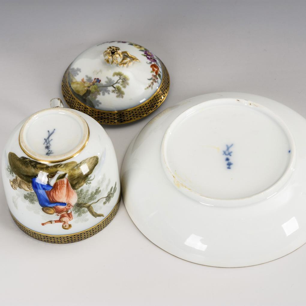 Glockentasse mit Asthenkel und Blütenknaufdeckel. Kobaltblaue Bordüre mit goldenem Korbmuster, schauseitig die Darstellung eines Schäferpaares in einer Parklandschaft. Bestoßung am Blütenknauf, Spiegel der Untertasse minimal berieben.