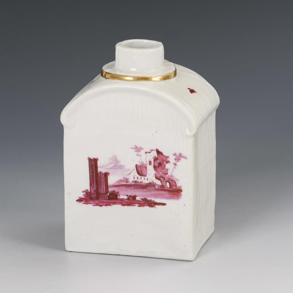 Rechteckige Dose mit gebrochen gerippter Wandung. Beidseitig eine Landschaftsdarstellung mit Architektur bzw. Ruinen. Ohne Deckel.
