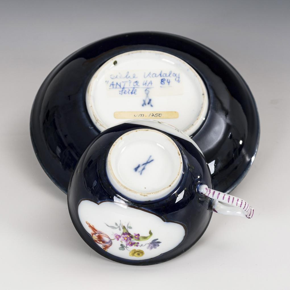 Kobaltblauer Fond, polychrome Blumenmalerei, brauner Rand. H Tasse 5 cm, Ø originale Untertasse 13,5 cm.