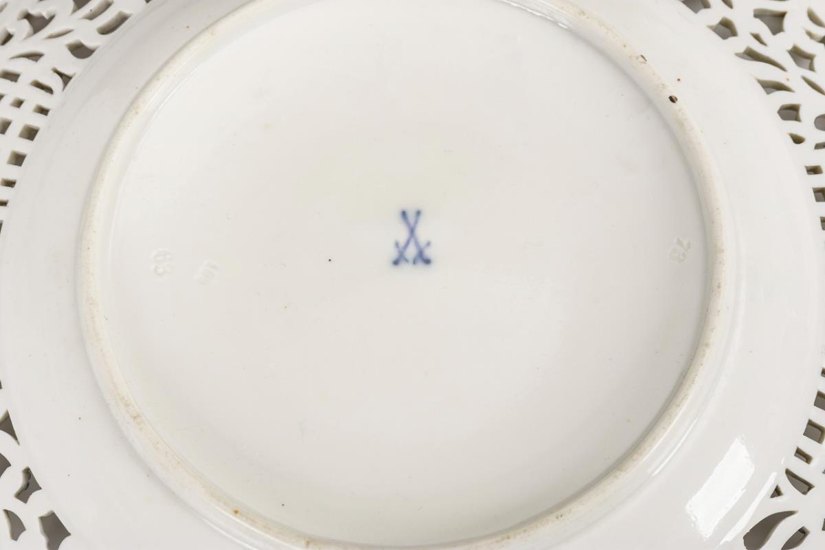 Form "Brühlsches Allerlei". Teller mit gitter- und blütendurchbrochener Fahne, im Spiegel eine fein gemalte Landschaftsinsel mit einer Glucke mit Küken. Unterseitig und Fahne restauriert.
