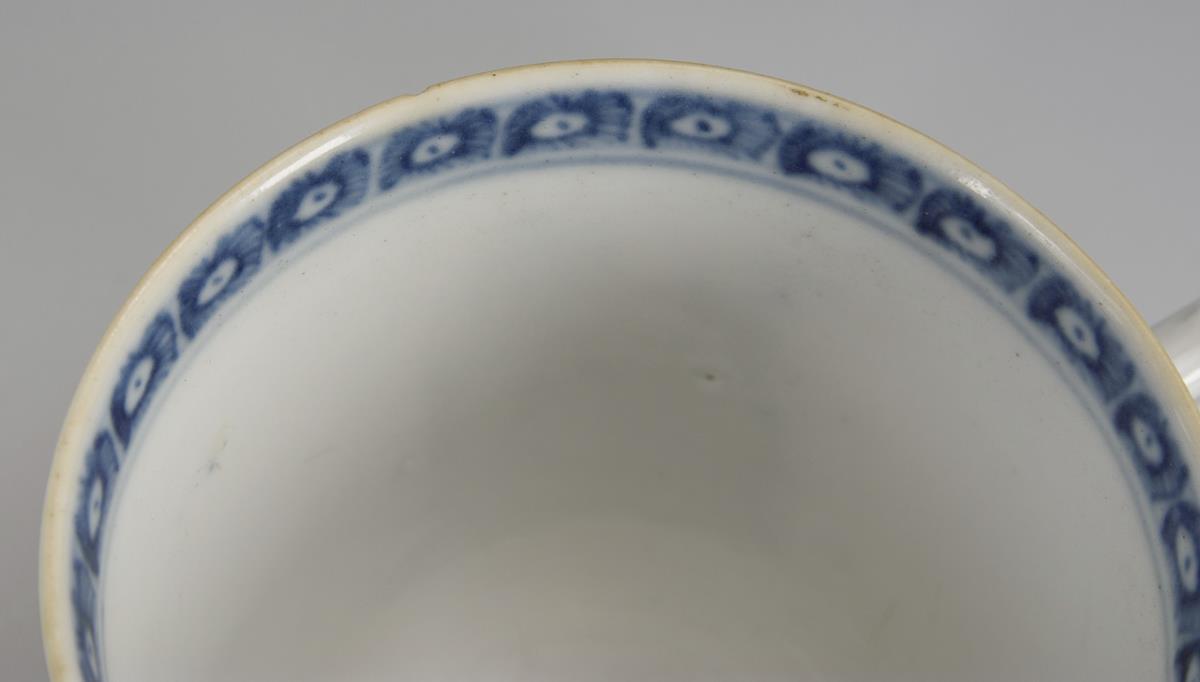 Glockentasse mit Bambushenkel und einer schauseitigen Kartusche mit Blumen- und Insektenmalerei, unterglasurblaue Bordüre. Minimaler Chip am Tassenrand, partiell berieben.