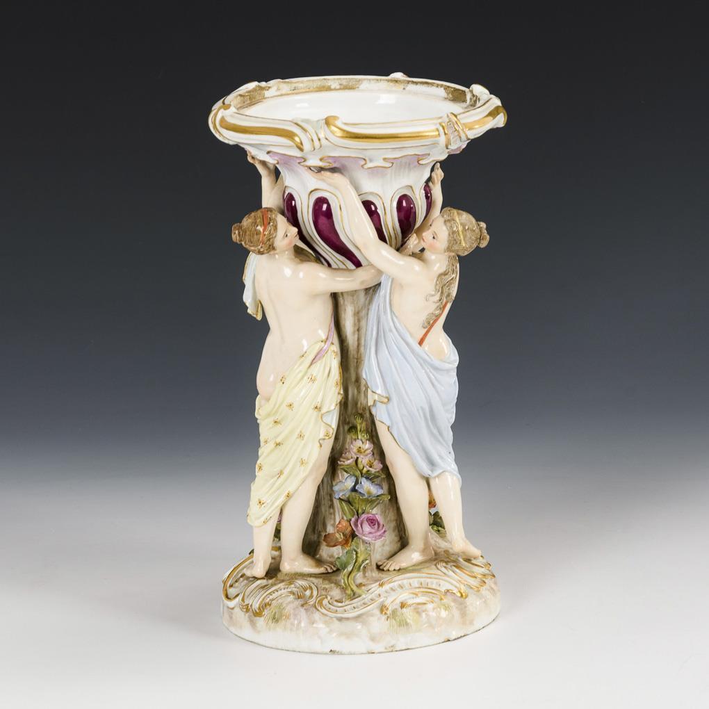 Drei, an einem Baumstamm stehende Grazien mit erhobenen Armen. Schale fehlt, Bestoßung am Stand und an den Blüten, 1 Finger bestoßen.