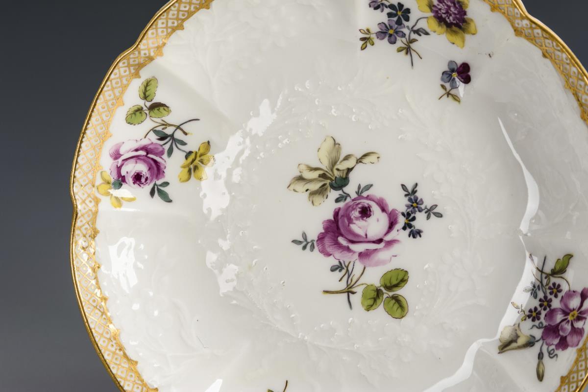 Polychrom bemalt, goldstaffiert. H Tasse 5 cm, Ø originale Untertasse 13,5 cm.