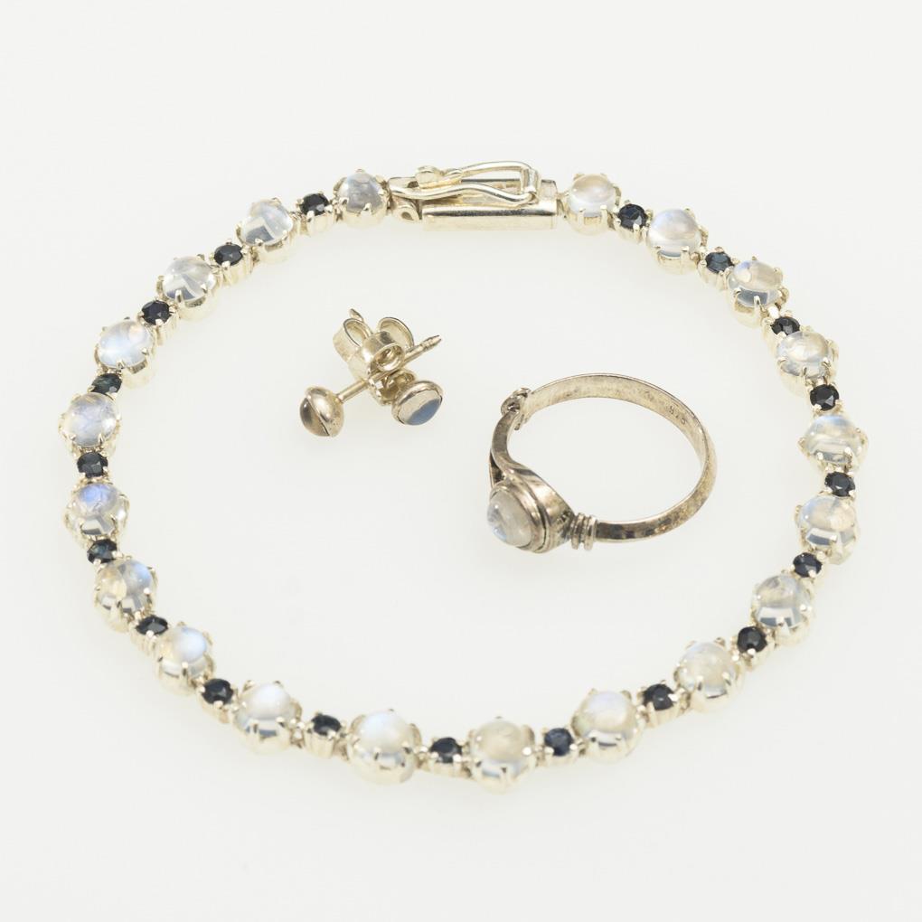 Silber 925 gestempelt. Armband L 20 cm. Ringgröße 51. Ohrstecker Ø 0,4 cm. 11,5/1,9/0,7 g.