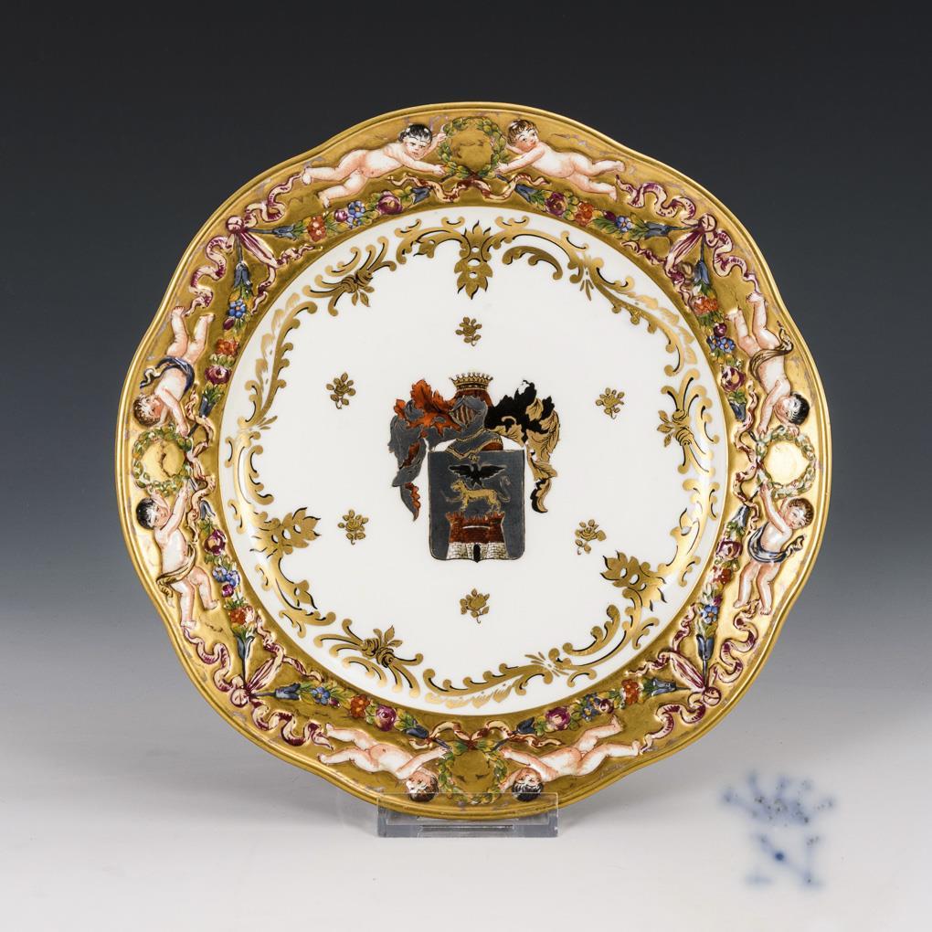 Teller mit Putten- und Blütenrelief auf der Fahne, im Spiegel die Darstellung eines Wappens mit Turm und Adler.