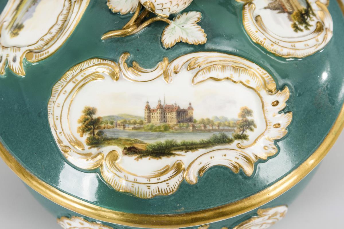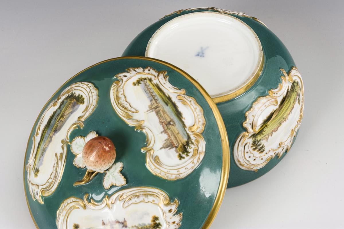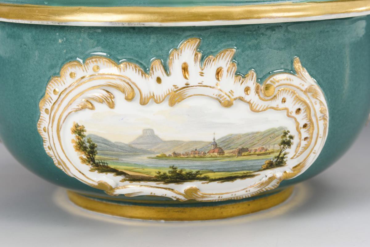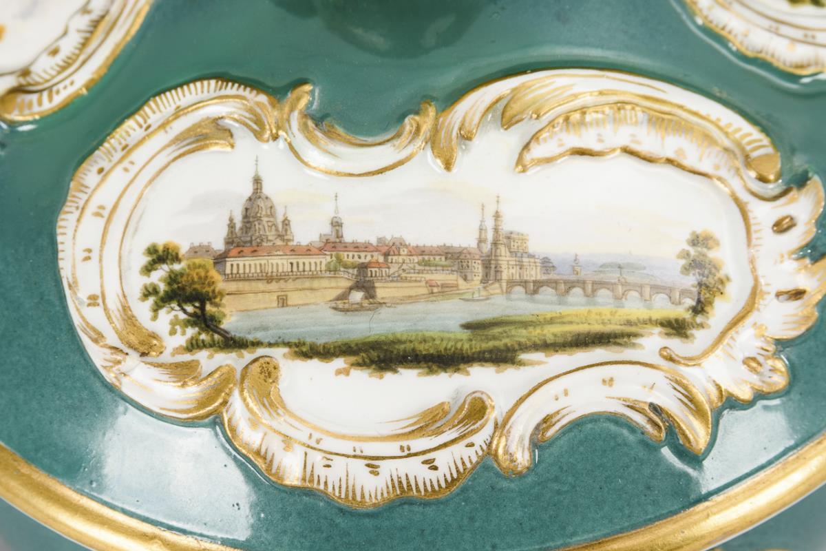 Dose mit dunkelgrünem Fond, in Rocaillereliefkartuschen gemalte Ansichten von Dresden und Umgebung (u.a. Elbufer Dresden mit Frauenkirche und Hofkirche, Moritzburg, Pillnitz, Elbsandsteingebirge). Deckel restauriert.