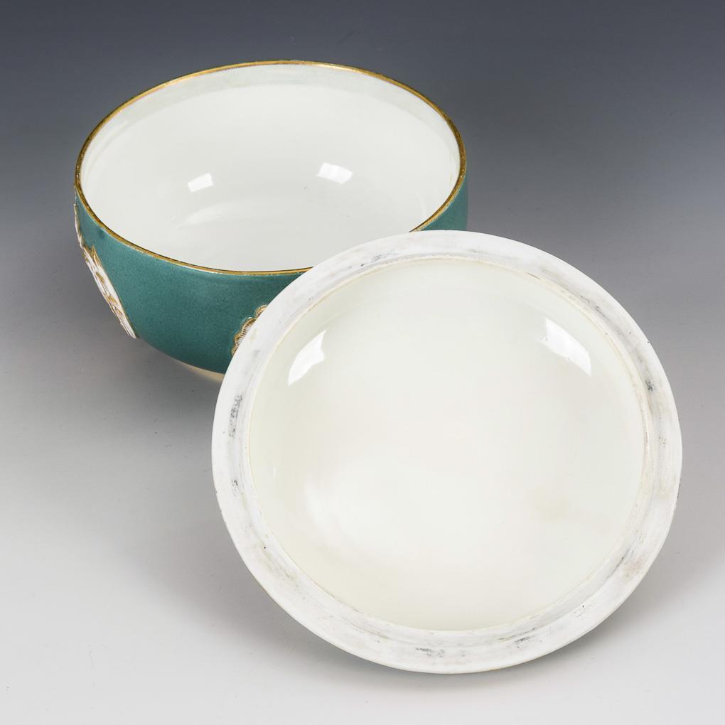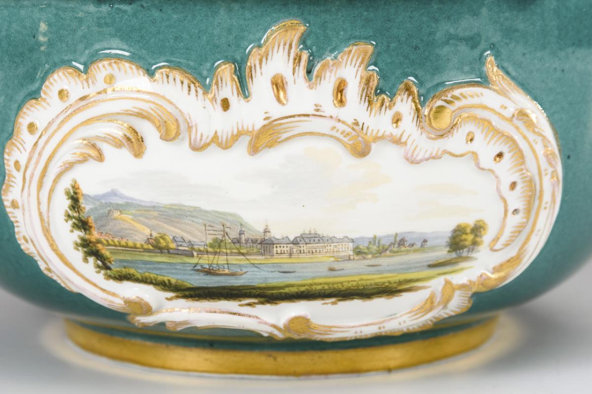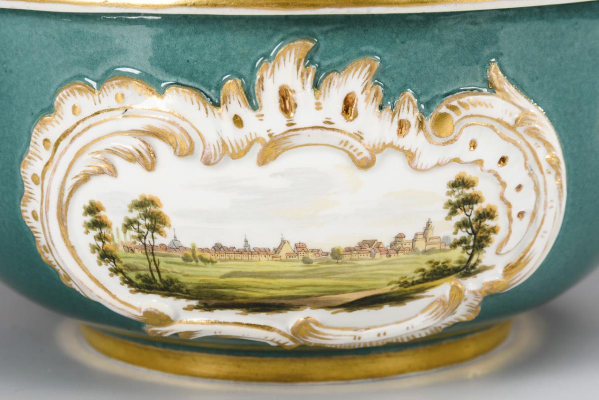 Dose mit dunkelgrünem Fond, in Rocaillereliefkartuschen gemalte Ansichten von Dresden und Umgebung (u.a. Elbufer Dresden mit Frauenkirche und Hofkirche, Moritzburg, Pillnitz, Elbsandsteingebirge). Deckel restauriert.