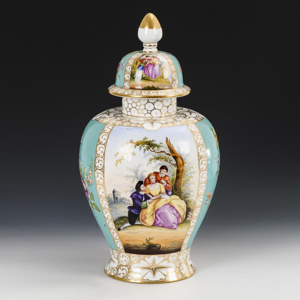 Deckelvase mit Watteau-Malerei. Potschappel.