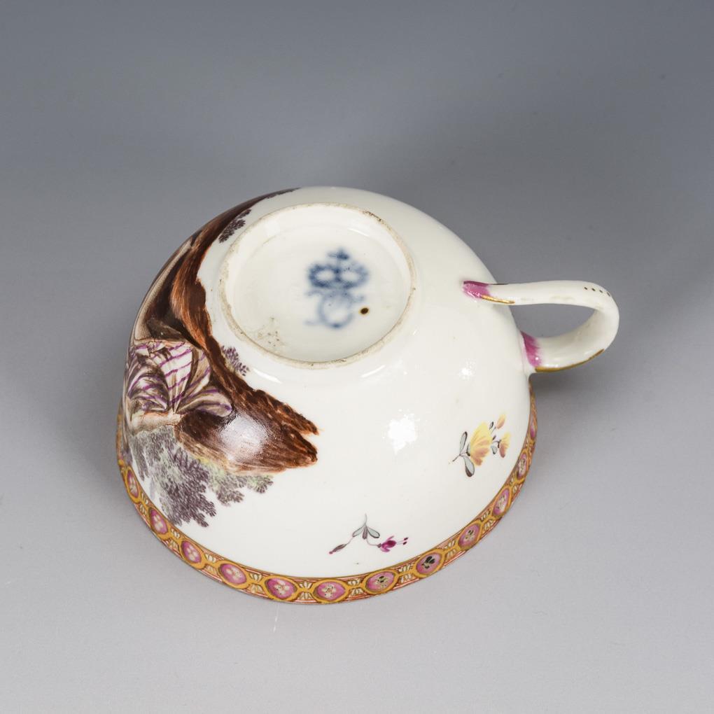 Bauchige Tasse mit Ohrenhenkel. Schauseitig die Darstellung der in einer Landschaft lagernden Venus. Ohne Untertasse. Gold berieben.
