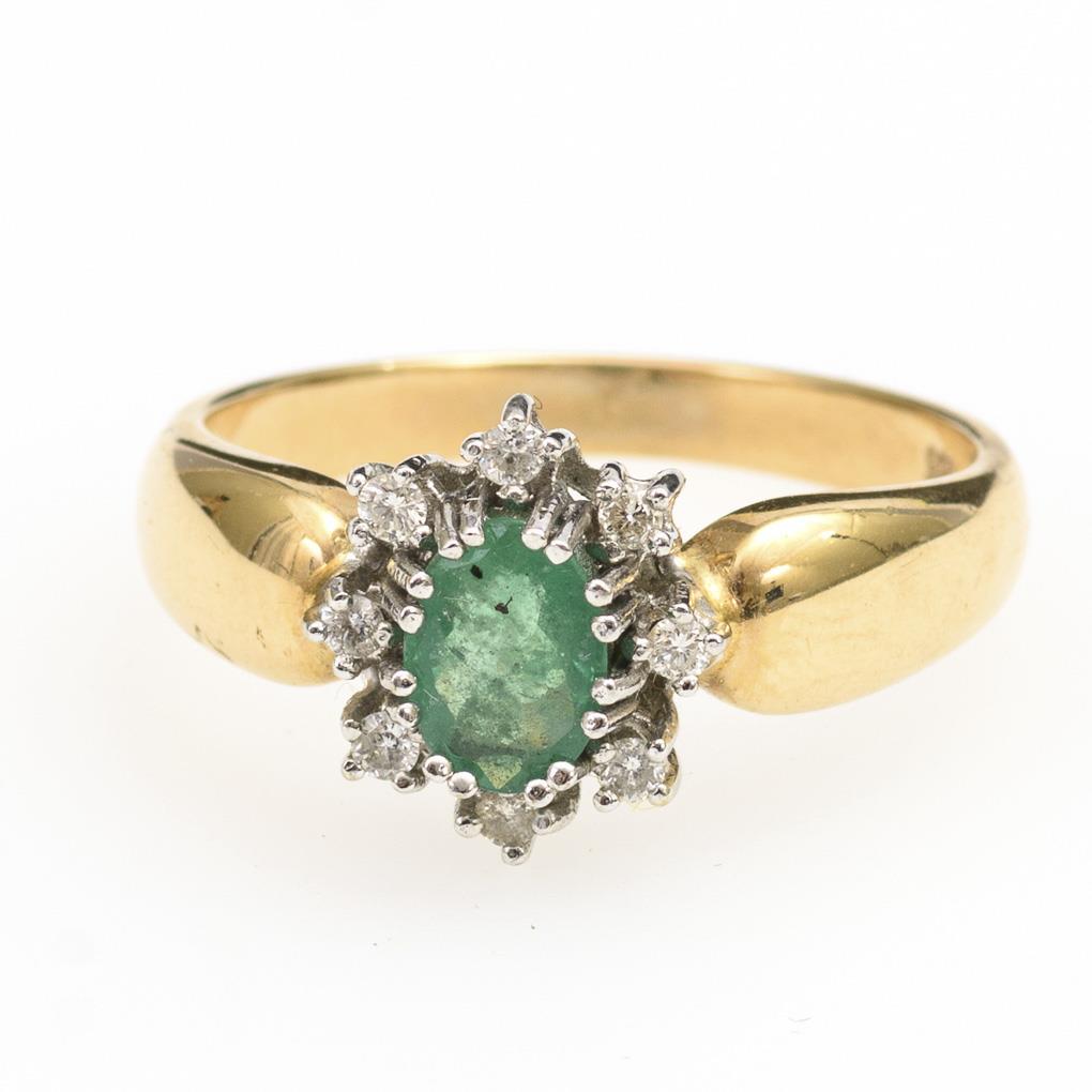 Krappengefasster Smaragd, umringt von 8 kleinen Brillanten, zwischen mittlerer Schiene.
